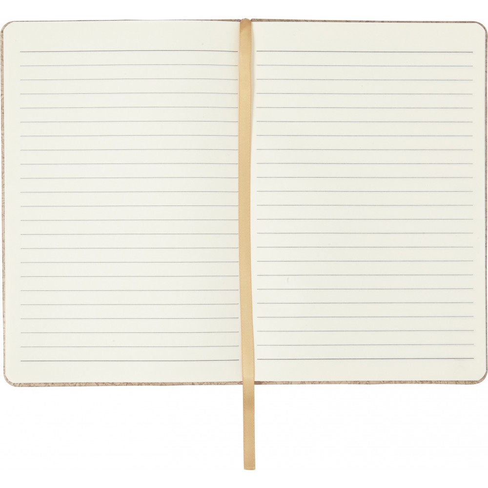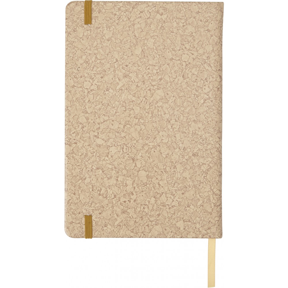 A5 méretű füzet parafa mintázattal, 96 vonalas lappal, színben illeszkedő jelzőszalaggal, gumipánttal. PU. Emblémázás: Tamponnyomás