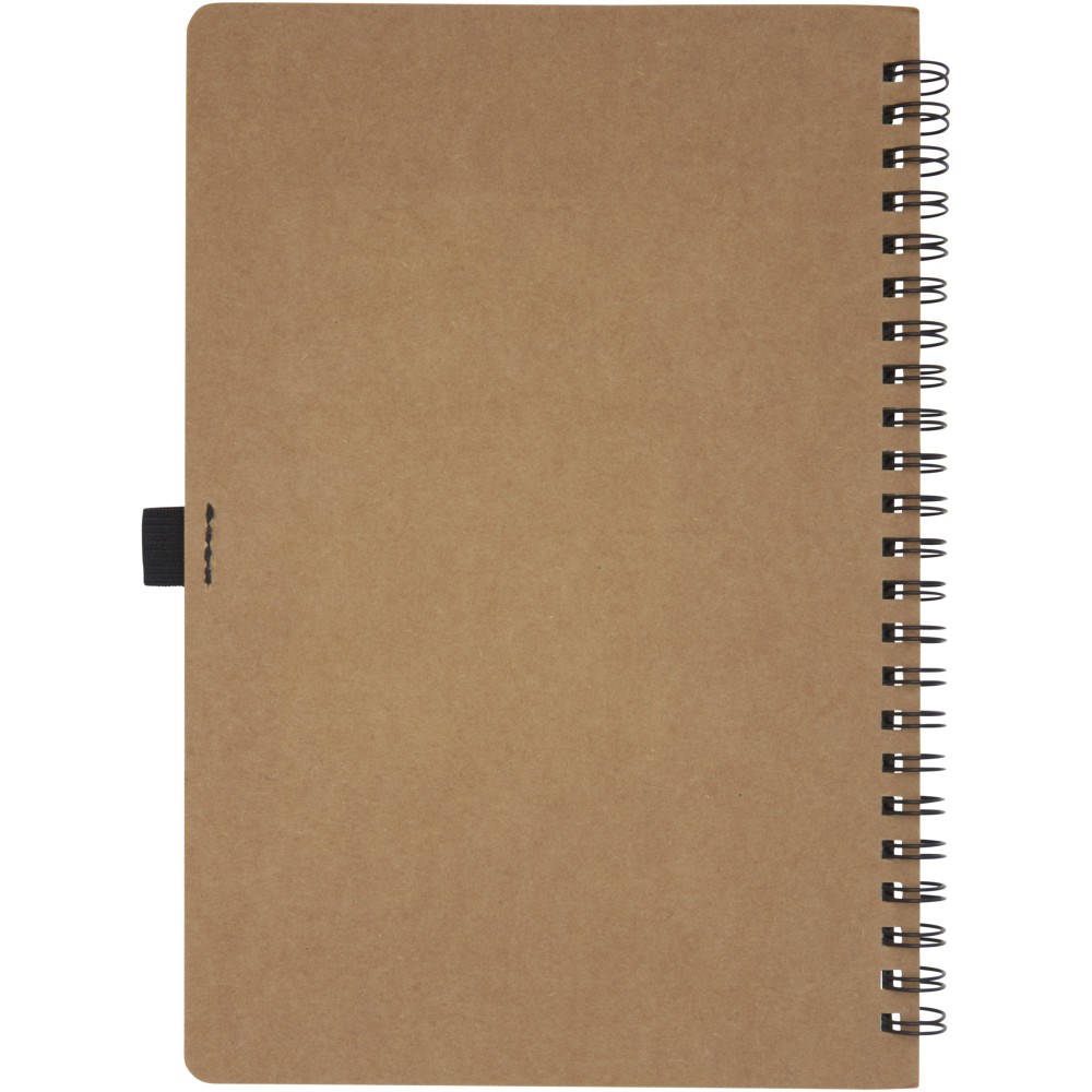 A5 méretű spirálfüzet újrahasznosított karton fedéllel, tollhurokkal. 70 db 60 g / m2 vonalas kőpapír lapok. A kőpapír 100% famentes és a gyártási eljárás során kevesebb energiát használnak fel, mint az újrahasznosított vagy új papír előállítása esetében. A papír vízálló és szakadásálló, természetes fehér színű (nem fehérített). Újrahasznosított karton, kőpapír. Emblémázás: Szitanyomás, Tamponnyomás