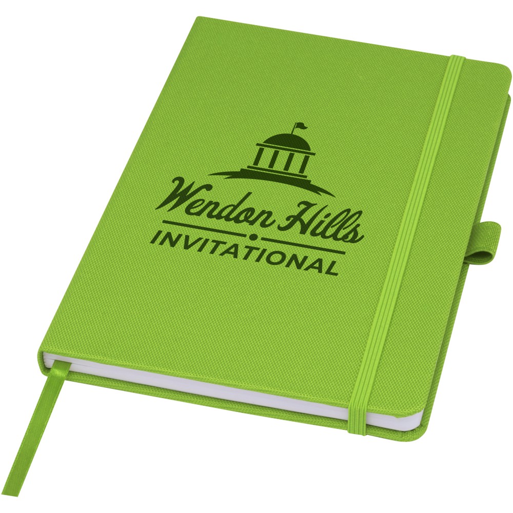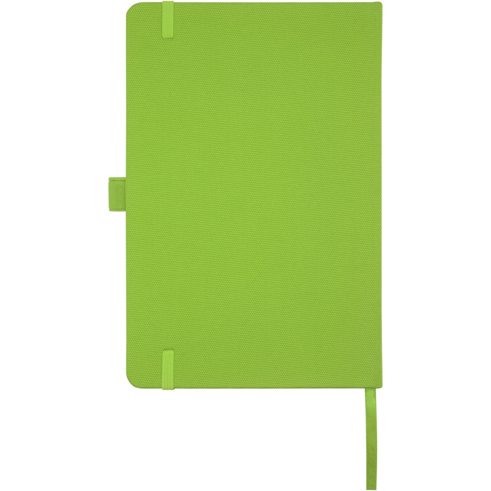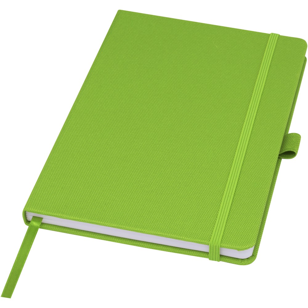 A5 jegyzetfüzet újrahasznosított PET műanyagból készült szövet borítóval. 80 lap 70 g/m2 újrahasznosított, vonalas papír, tolltartó hurok és szalag könyvjelző. Kombinálható a 107757 Honua RPET golyóstollal. Emblémázás: Szitanyomás