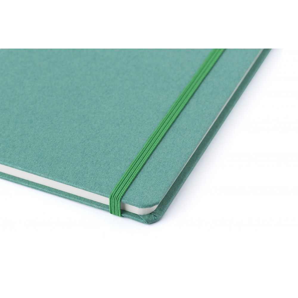 Újrahasznosított kartonból készült A5-ös jegyzetfüzet 80 vonalas lappal. Gumis záródás és könyvjelző szalag. Emblémázás: Tamponnyomás, UV nyomtatás