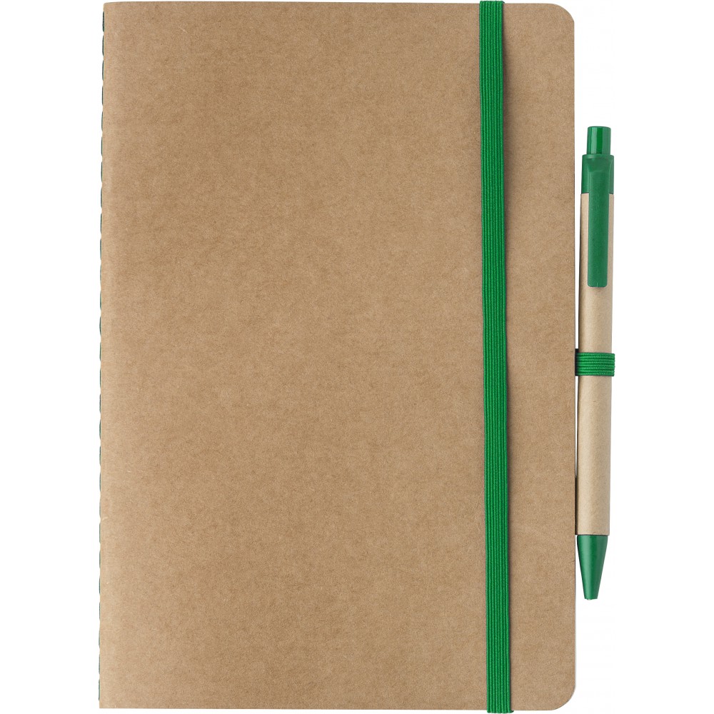 Újrahasznosított karton jegyzetfüzet 60 sima lappal. Tartalmazza a hozzáillő karton/szalma tollat kék tollbetéttel. Gumis összefogó pánt és tollhurok. Emblémázás: Szitanyomás, Tamponnyomás, UV nyomtatás