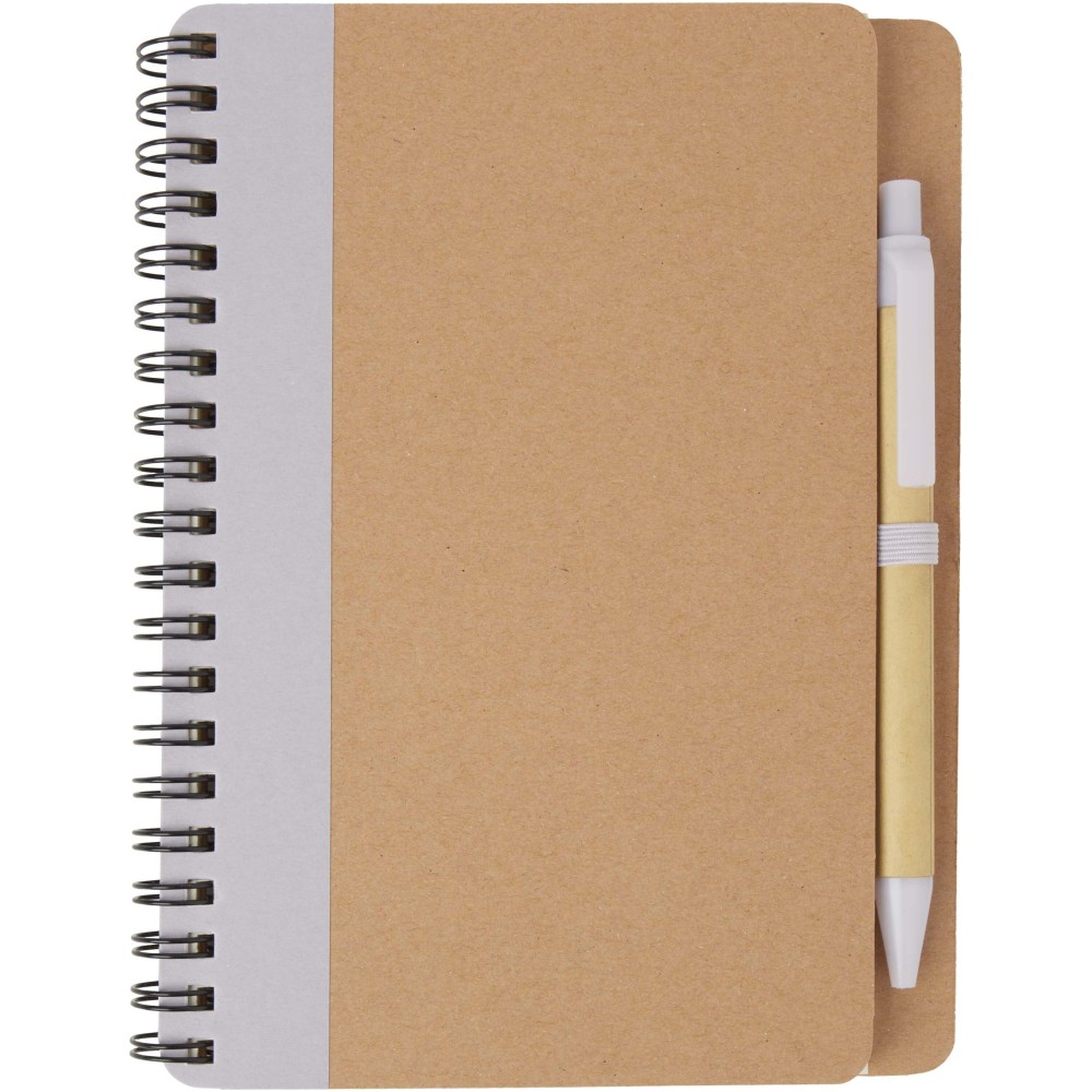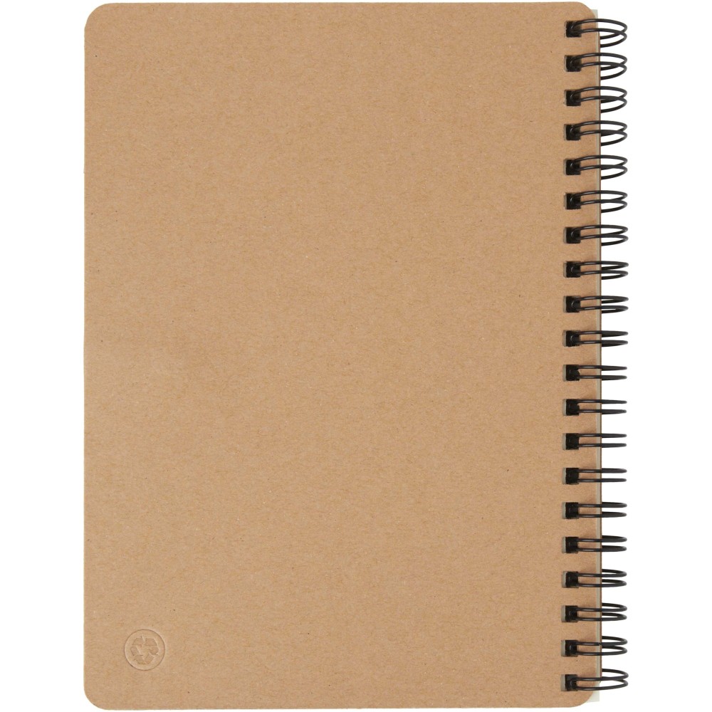 Újrahasznosított papírfedelű jegyzetfüzet 60 db újrahasznosított papírból készült A6-os méretű vonalas lappal, hozzáillő tollal. A toll fekete tollbetétel érkezik és külön van csomagolva. Emblémázás: Szitanyomás, Tamponnyomás