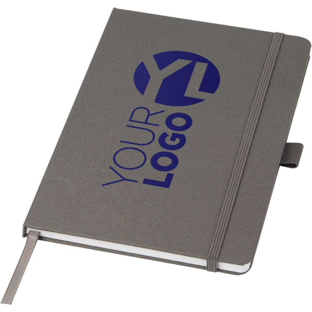 A5 jegyzetfüzet újrahasznosított PET műanyagból készült szövet borítóval. 80 lap 70 g/m2 újrahasznosított, vonalas papír, tolltartó hurok és szalag könyvjelző. Kombinálható a 107757 Honua RPET golyóstollal. Emblémázás: Szitanyomás