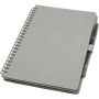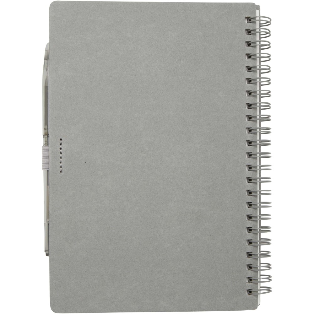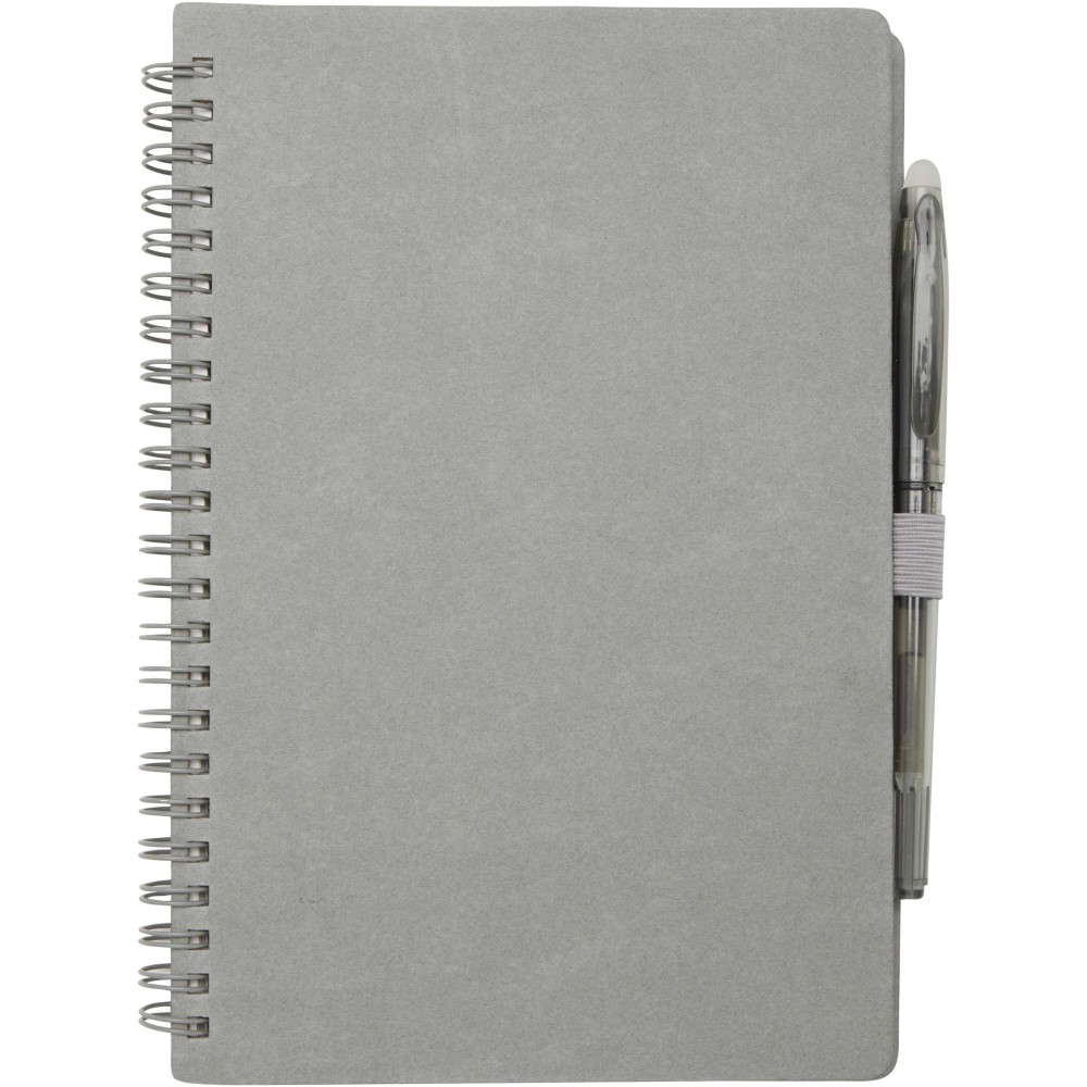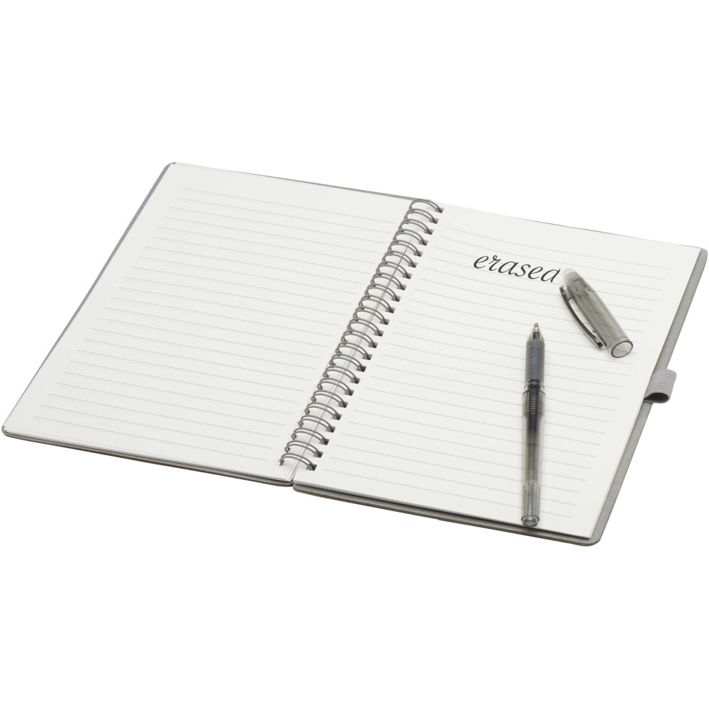 Újrahasználható, kőből készült kemény fedeles jegyzetfüzet és toll szett. A jegyzetfüzet borítója kartonból készült, lekerekített sarkokkal, és 32 lap 120 g/m2 súlyú vonalas kőpapír lapot tartalmaz. A kőpapír 100%-ban famentes, és előállítása kevesebb energiát igényel, mint az újrahasznosított vagy új cellulózpapíré. A jegyzetfüzet hátulján zseb található a mellékelt fekete törlőkendő tárolására. Tartozék továbbá egy újrahasznosított műanyagból készült törölhető toll átlátszó tolltesttel, fehér radírral a tetején, és színes, tömör fogórésszel. Tinta színe: fekete. Íráshossz: 250 méter. Tollhegy mérete: 0,7 mm. Emblémázás: Tamponnyomás