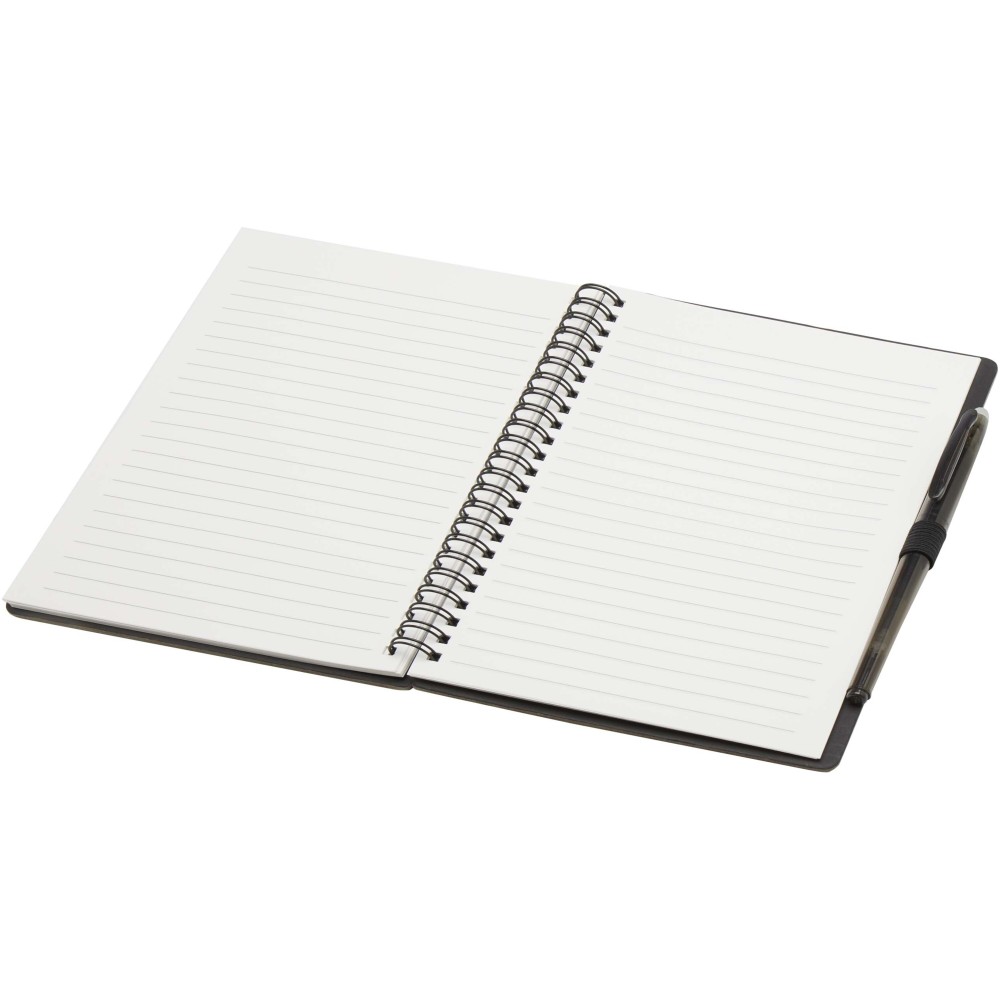 Újrahasználható, kőből készült kemény fedeles jegyzetfüzet és toll szett. A jegyzetfüzet borítója kartonból készült, lekerekített sarkokkal, és 32 lap 120 g/m2 súlyú vonalas kőpapír lapot tartalmaz. A kőpapír 100%-ban famentes, és előállítása kevesebb energiát igényel, mint az újrahasznosított vagy új cellulózpapíré. A jegyzetfüzet hátulján zseb található a mellékelt fekete törlőkendő tárolására. Tartozék továbbá egy újrahasznosított műanyagból készült törölhető toll átlátszó tolltesttel, fehér radírral a tetején, és színes, tömör fogórésszel. Tinta színe: fekete. Íráshossz: 250 méter. Tollhegy mérete: 0,7 mm. Emblémázás: Tamponnyomás