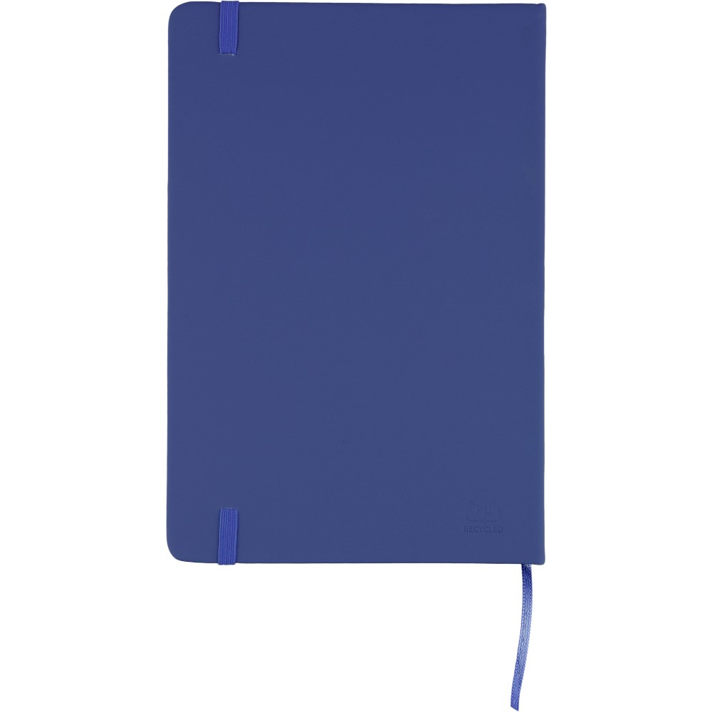 A5-ös méretű jegyzetfüzet rPET PU anyagból készült kemény borítóval, 80 vonalas lappal (70g/m2), színben illeszkedő gumipánttal és könyvjelző szalaggal. Az újrahasznosított anyagra utaló dombornyomott logóval a füzet hátoldalán. Emblémázás: Szitanyomás, Tamponnyomás, UV nyomtatás