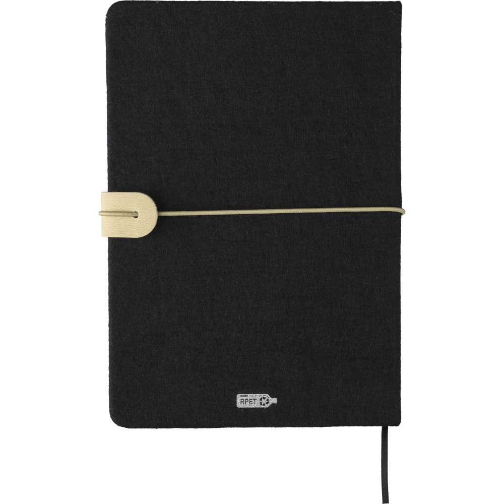 Újrahasznosított filcből készült jegyzetfüzet, kb. A5-ös méretű, 80 lapos. Puha tapintású kemény borítóval, gumiszalaggal és kívül PU zárópánttal. Szalagos könyvjelzővel és 70 g/m2-es vonalas papírral. A hátoldalán lézergravírozott újrahasznosított logóval. Emblémázás: Szitanyomás