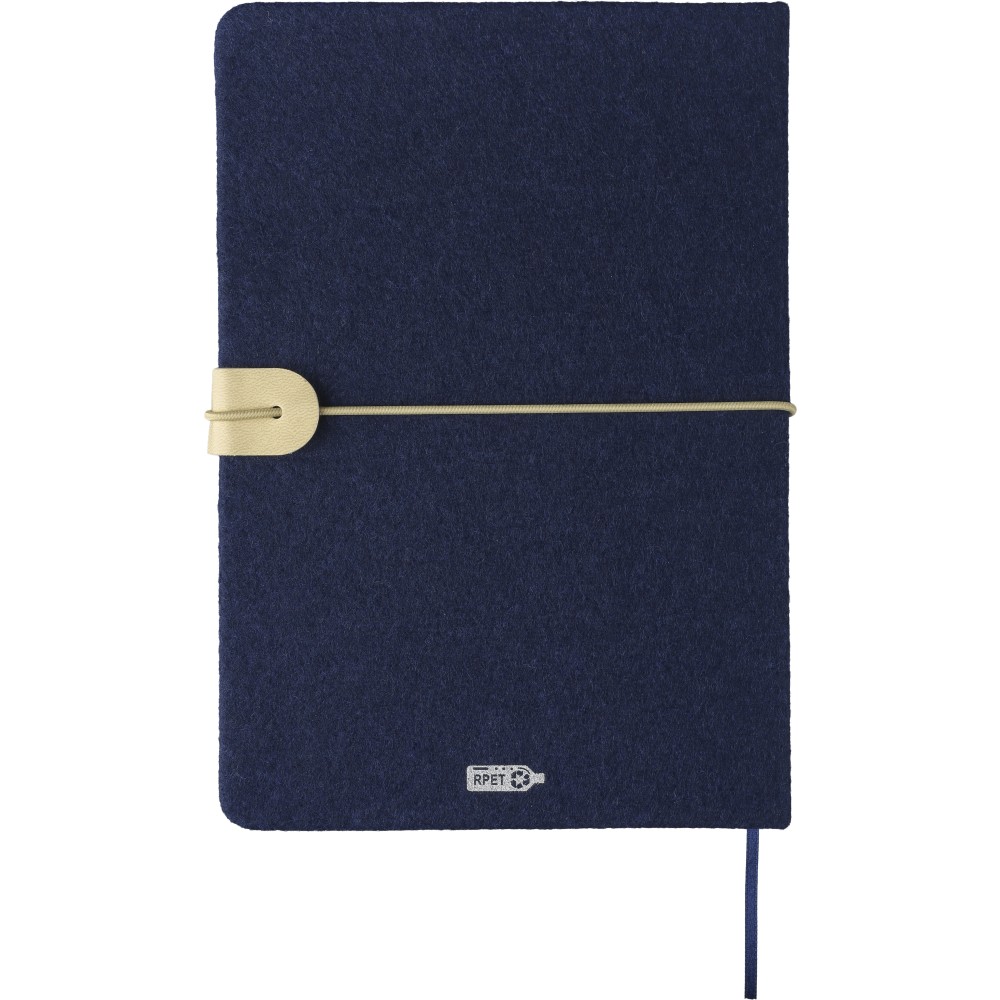 Újrahasznosított filcből készült jegyzetfüzet, kb. A5-ös méretű, 80 lapos. Puha tapintású kemény borítóval, gumiszalaggal és kívül PU zárópánttal. Szalagos könyvjelzővel és 70 g/m2-es vonalas papírral. A hátoldalán lézergravírozott újrahasznosított logóval. Emblémázás: Szitanyomás