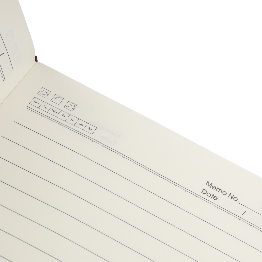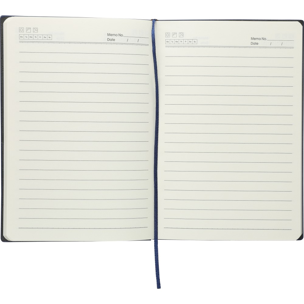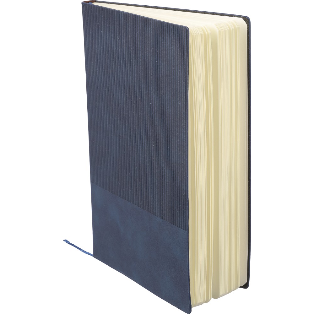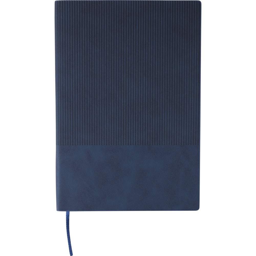 Újrahasznosított PU jegyzetfüzet, kb. A5-ös méretű, 100 lapos. Kemény borítóval és kordbársony hatású bevonattal az elülső és a hátlap felső részén. Tartalmaz egy szalagos könyvjelzőt és 80 g/m2-es vonalas lapokat. A hátoldalon dombornyomott újrahasznosított logóval. Emblémázás: Szitanyomás