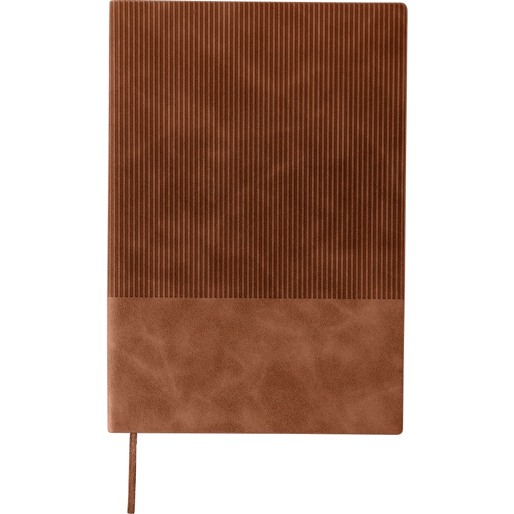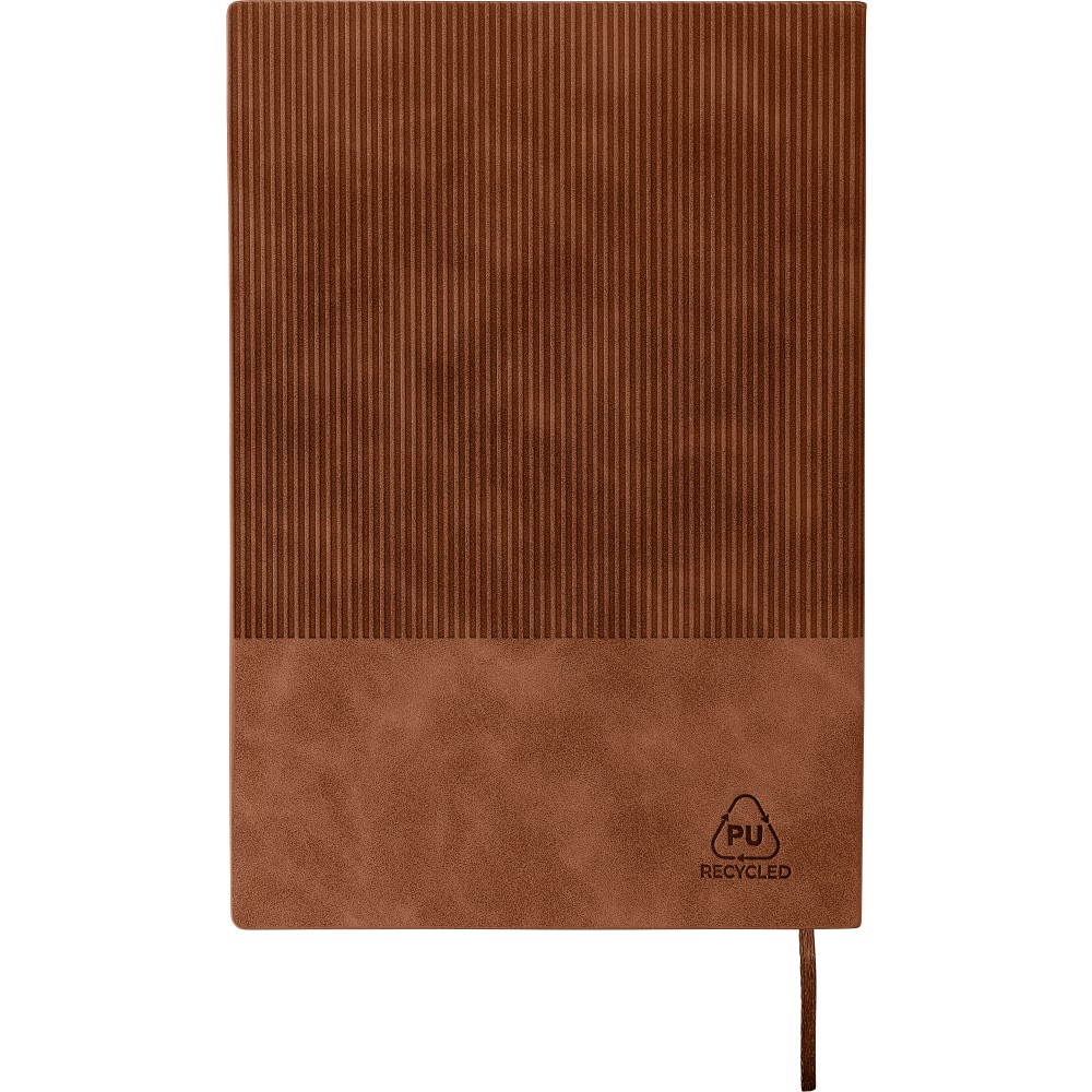 Újrahasznosított PU jegyzetfüzet, kb. A5-ös méretű, 100 lapos. Kemény borítóval és kordbársony hatású bevonattal az elülső és a hátlap felső részén. Tartalmaz egy szalagos könyvjelzőt és 80 g/m2-es vonalas lapokat. A hátoldalon dombornyomott újrahasznosított logóval. Emblémázás: Szitanyomás