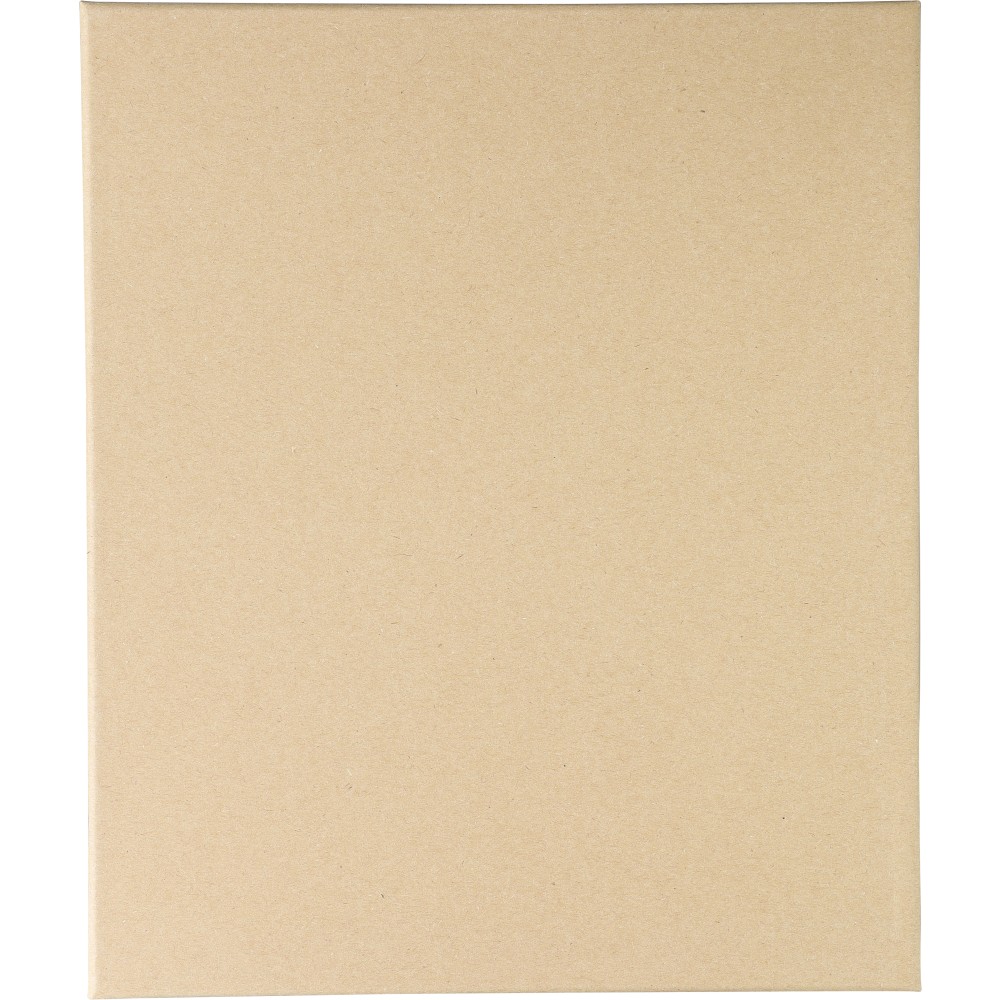 Újrahasznosított PU jegyzetfüzet és golyóstoll szett. A jegyzetfüzet kb. A5-ös méretű, 100 lapos, 80 g/m2-es vonalas lapokkal és szalagos könyvjelzővel, kordbársony hatású borítóval és dombornyomott újrahasznosított logóval rendelkezik. A golyóstoll gumírozott felülettel, csíkos markolattal, krómozott heggyel és lézergravírozott újrahasznosított logóval rendelkezik. Erős barna kartondobozban, EVA betéttel. Kék tollbetéttel szállítjuk. Emblémázás: Gravírozás, Szitanyomás, UV nyomtatás