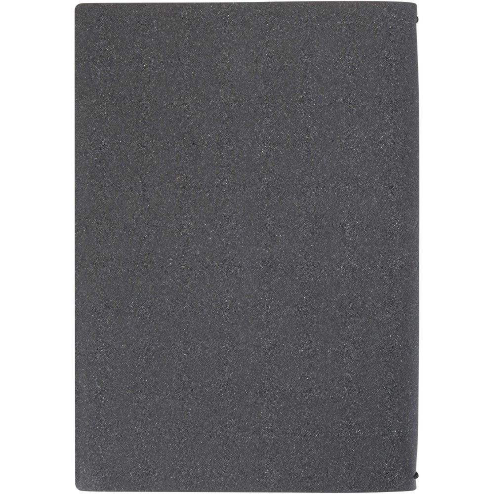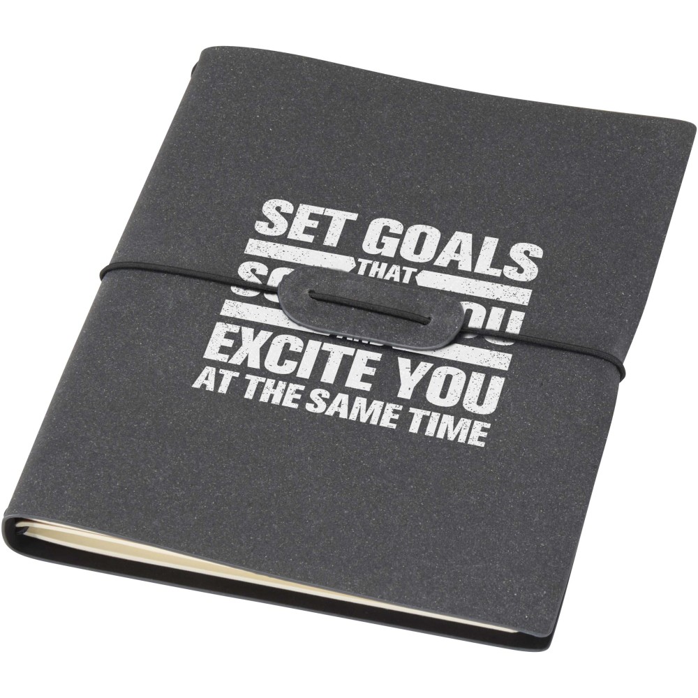 A Slyk A5 újratölthető füzet újrahasznosított műanyag borítóval és gumiszalagos záródással rendelkezik, amely két belső füzetet tart biztonságosan: egy pontozottat és egy vonalazottat. Mindegyik füzet 32 krémszínű, 70 g/m2 súlyú lapot tartalmaz, lekerekített sarkokkal és látható gerincvarrással a kézműves hatás érdekében. A füzetek borítói kartonból készülnek. Emblémázás: Szitanyomás, Tamponnyomás