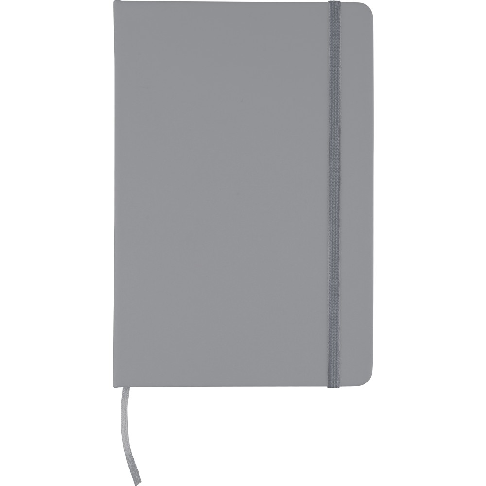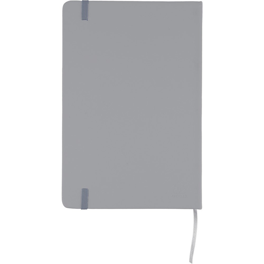 A5-ös méretű jegyzetfüzet rPET PU anyagból készült kemény borítóval, 80 vonalas lappal (70g/m2), színben illeszkedő gumipánttal és könyvjelző szalaggal. Az újrahasznosított anyagra utaló dombornyomott logóval a füzet hátoldalán. Emblémázás: Szitanyomás, Tamponnyomás, UV nyomtatás