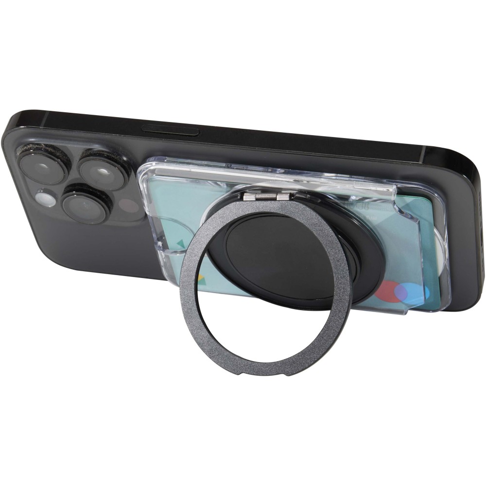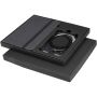 Praktikus ajándékszett, amely egy A6-os jegyzetfüzetet és egy MagSafe kártyatartót tartalmaz. A jegyzetfüzet sötétszürke, újrahasznosított műanyag borítással, 80 vonalas, krém színű, 70 g/m2 súlyú lappal és fekete gumis zárópánttal rendelkezik. Az átlátszó MagSafe kártyatartó egy kártya tárolására alkalmas, és mágnesesen rögzíthető az iPhone 12 vagy újabb modellekhez, de a csomag tartalmaz egy extra fémgyűrűt is a más típusú telefonokkal való használathoz. Mindkét termék elegáns, fekete karton ajándékdobozban érkezik. Emblémázás: Szitanyomás