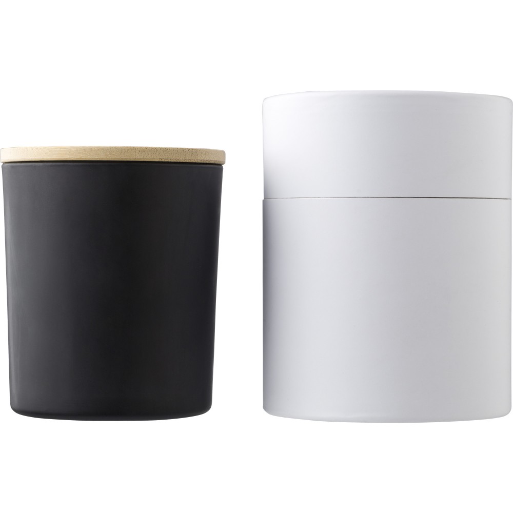 Üveggyertya növényi alapú viasszal és bambusz fedővel. A gyertya főleg növényi viaszt (karnaubaviaszt) tartalmaz, égési ideje körülbelül 20 óra. Négy illat az üveg színétől függően: fahéj (piros), vanília (fehér), szantálfa (fekete) és jázmin (zöld). Egyenként, fehér papírpalástba csomagolva. Emblémázás: Gravírozás, Tamponnyomás