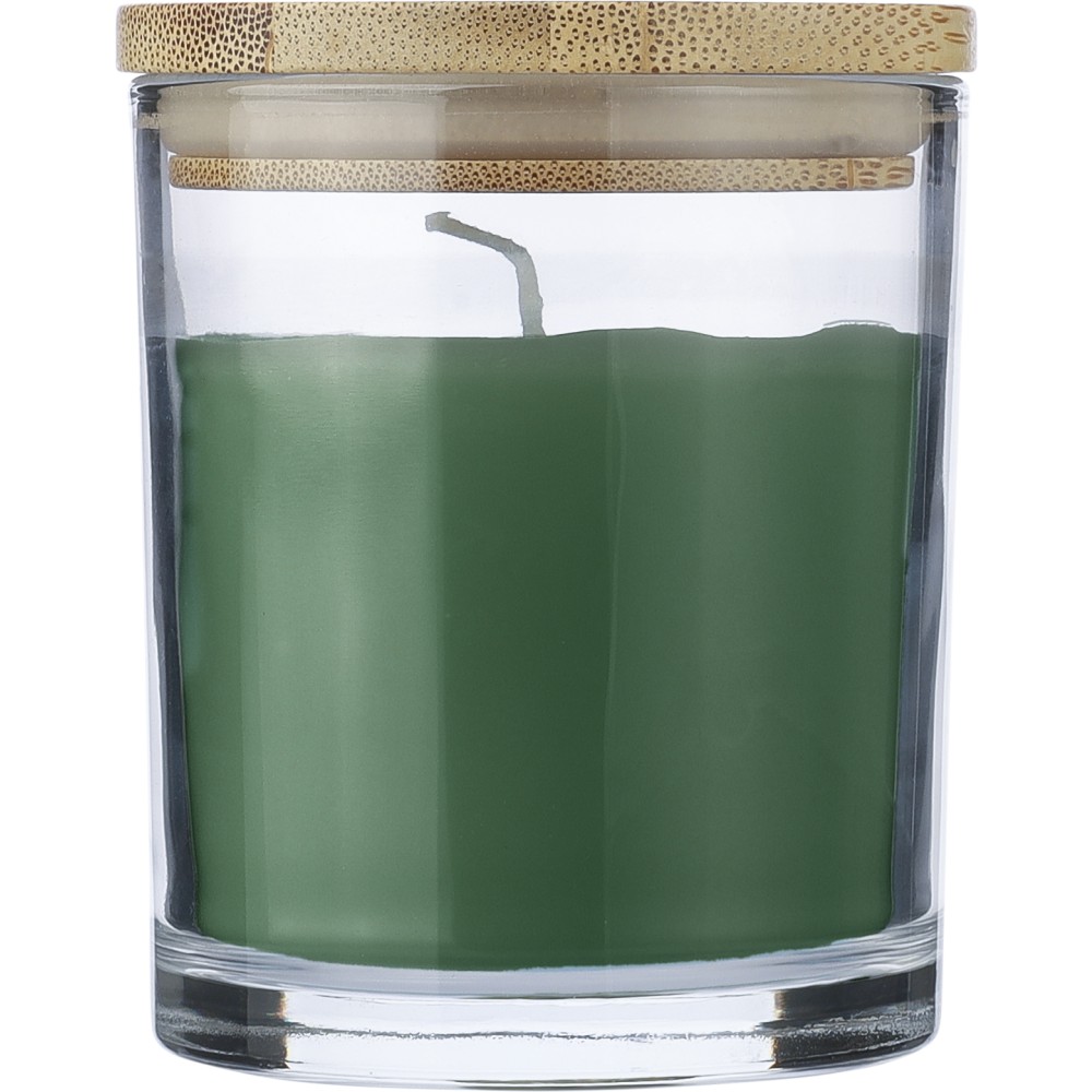 Üveg gyertyatartó 120 g vanília illatú, színes viasszal és bambusz fedéllel. Kb. 20 óra égési idővel. Csomagolása fehér papírhenger. Emblémázás: Gravírozás, Tamponnyomás