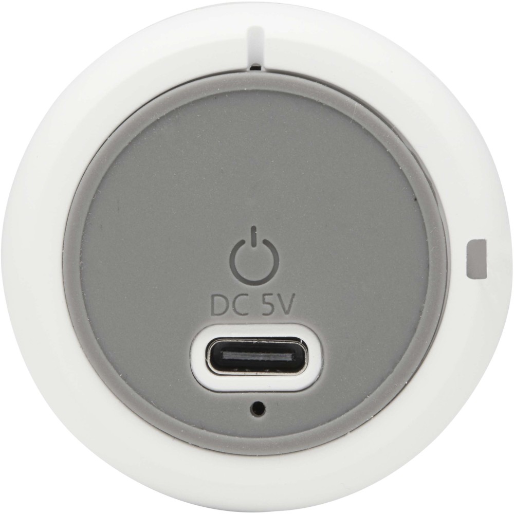 A kompakt Velkis 3W Bluetooth hangszóró újrahasznosított műanyagból készült, így bárhová magával viheti kedvenc zenéit. A termék kényelmes csuklópánttal és egyszerű, egygombos vezérléssel rendelkezik a praktikus használat érdekében. A 300 mAh kapacitású akkumulátor és a Type-C töltőcsatlakozó tökéletes hordozható audiómegoldást kínál, a csomag pedig tartalmaz egy 30 cm-es USB-A - Type-C töltőkábelt is. Emblémázás: Tamponnyomás, UV nyomtatás