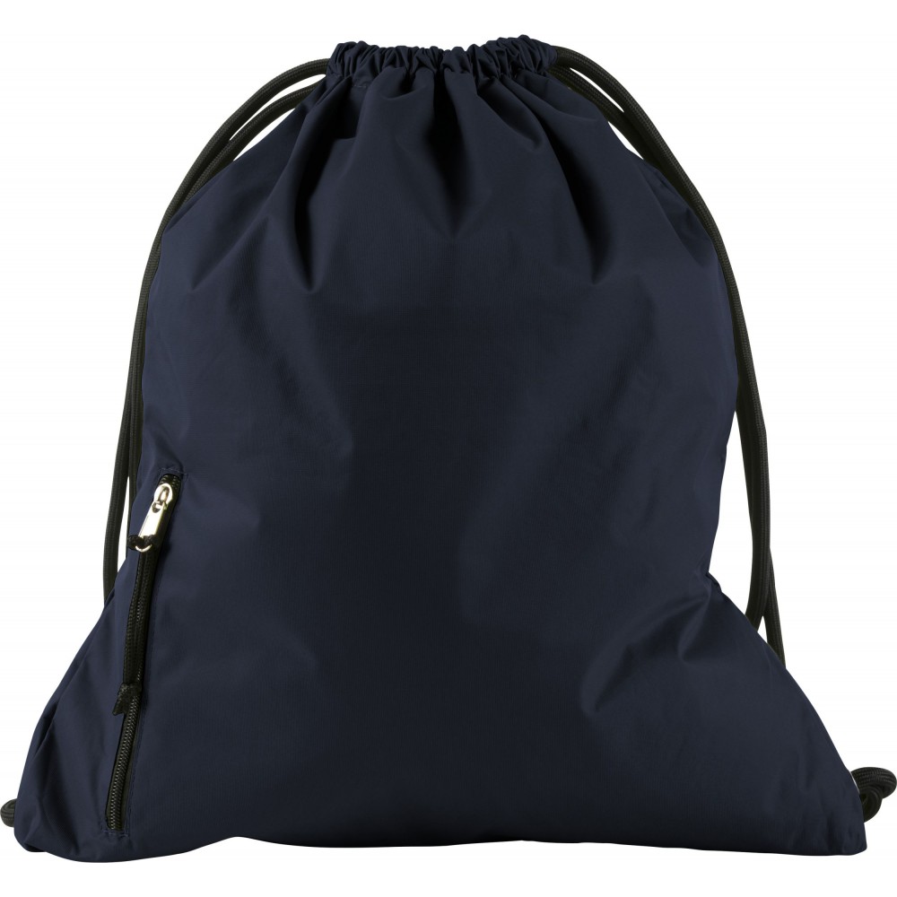 Tornazsák húzózsinórral, elöl cipzáras zsebbel. 190T nylon. Emblémázás: Szitanyomás