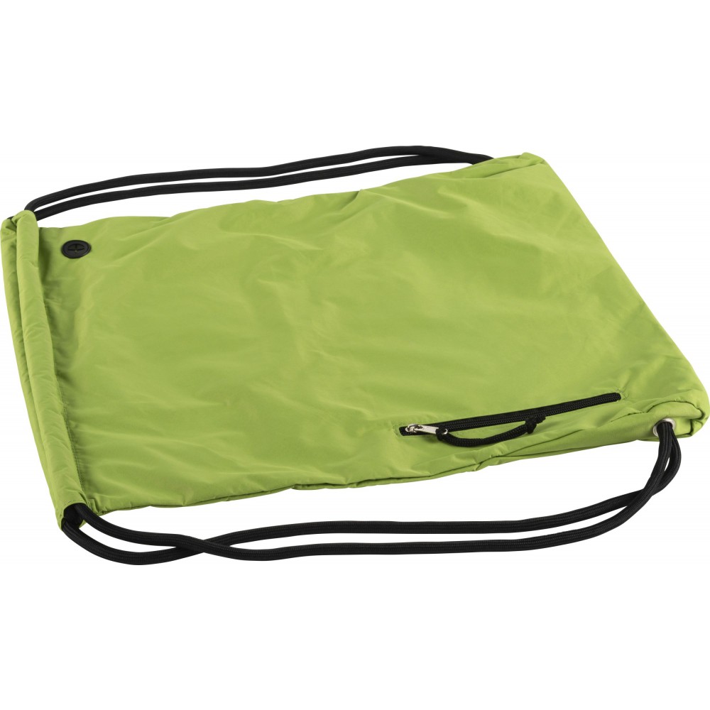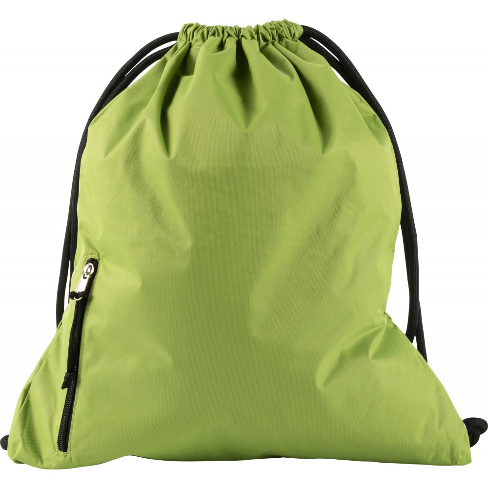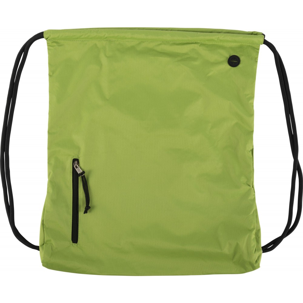 Tornazsák húzózsinórral, elöl cipzáras zsebbel. 190T nylon. Emblémázás: Szitanyomás