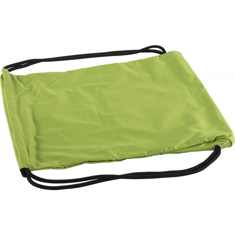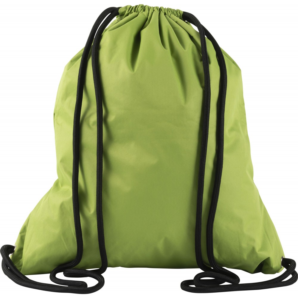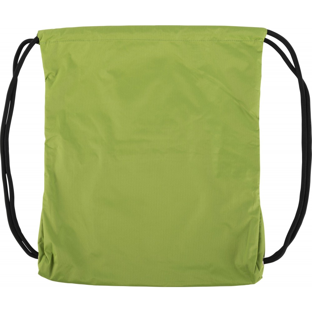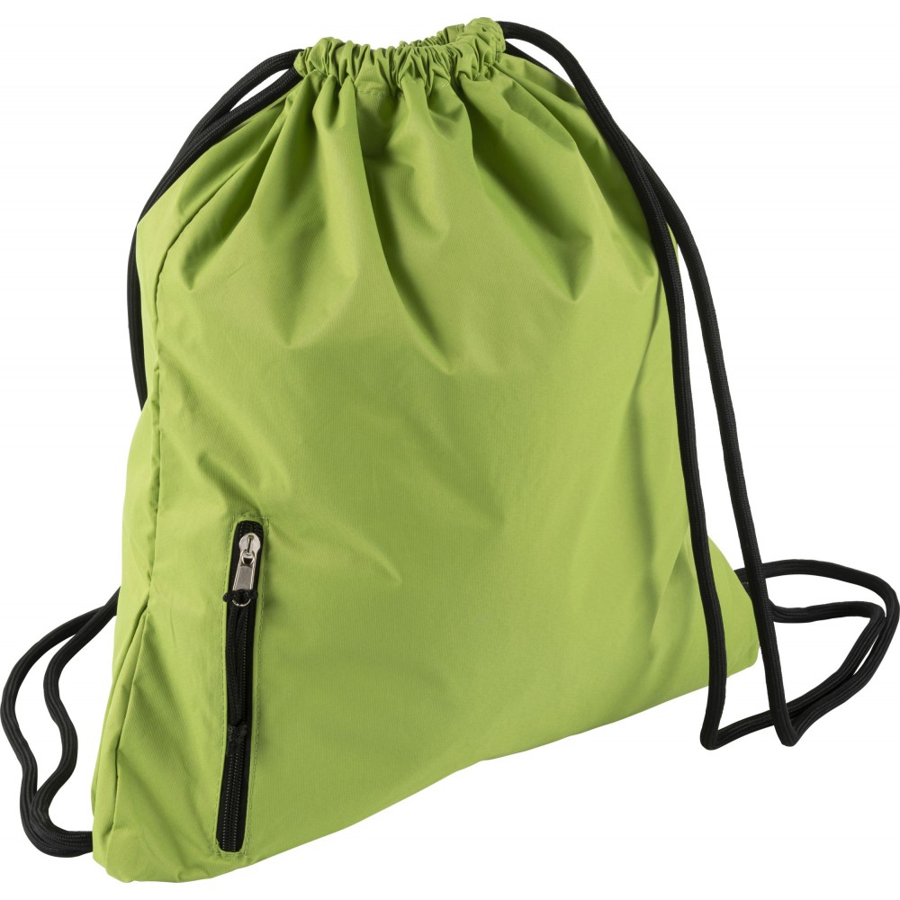 Tornazsák húzózsinórral, elöl cipzáras zsebbel. 190T nylon. Emblémázás: Szitanyomás