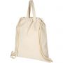 Tornazsák újrahasznosított pamutból, egy nagy fő résszel, pamut húzózsinórral. Fülek magassága: 31 cm. Teherbírás: max. 5 kg. 210 g/m2 pamut. Emblémázás: Szitanyomás