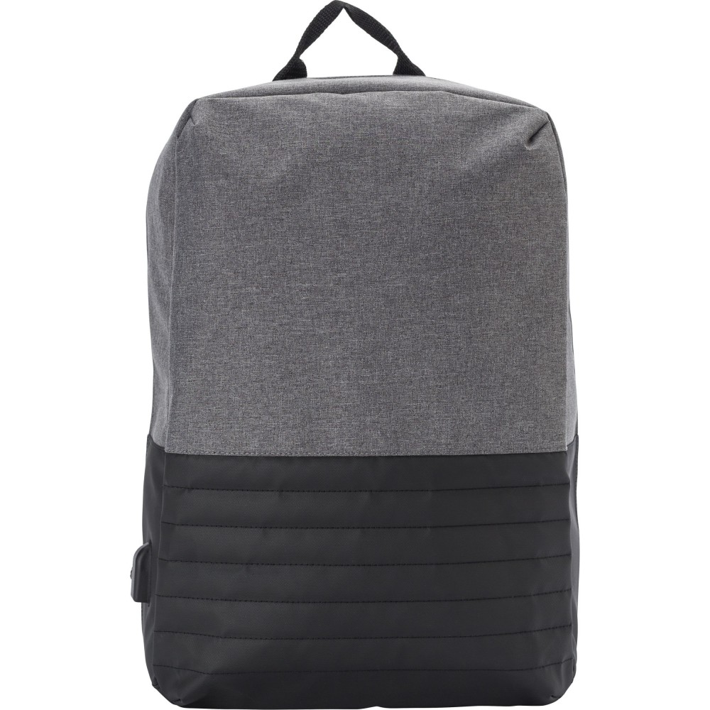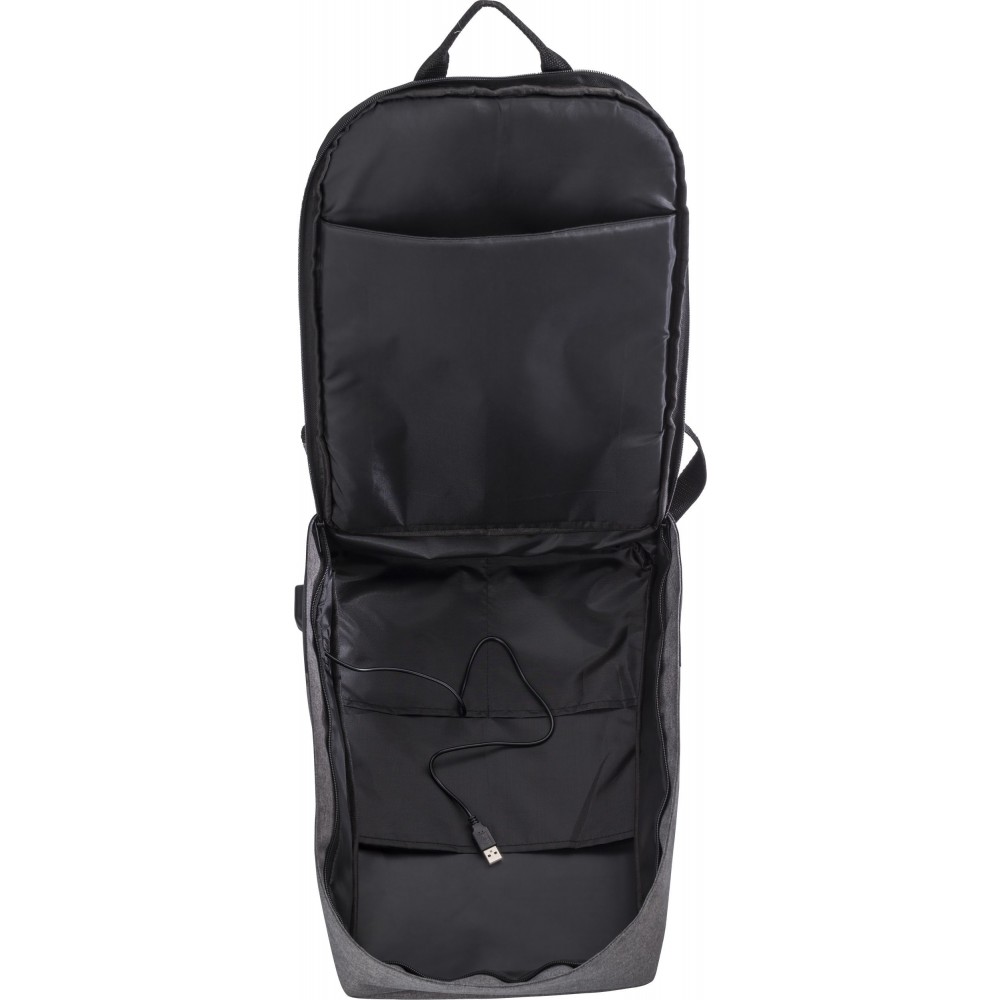 Kéttónusú lopásgátló hátizsák állítható és párnázott vállpánttal, párnázott hátkialakítással. Egy nagy fő rekesz cipzárral és párnázott laptop rekesszel (15"-es laptop számára). Külső USB-port, belül kábel. 600D + 300D PVC. Emblémázás: Szitanyomás