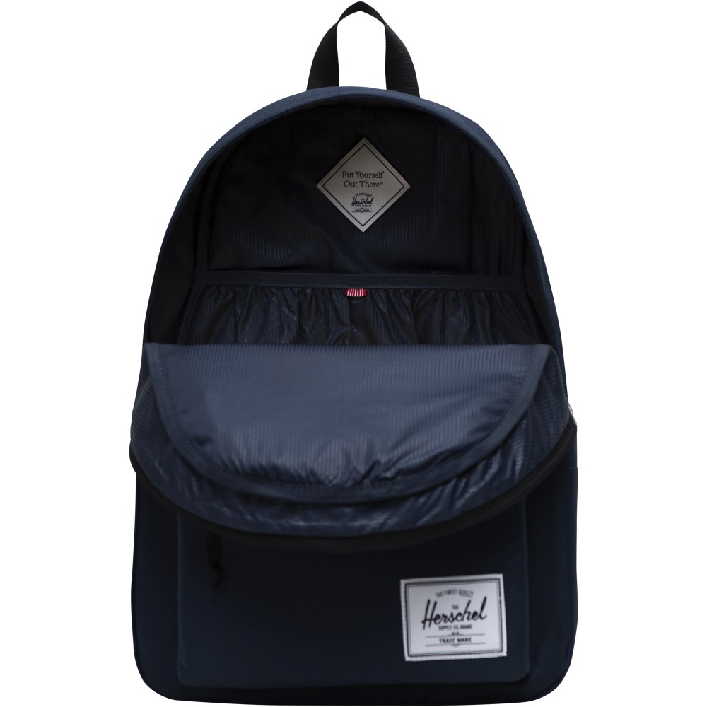 Készülj fel a következő kalandodra a Herschel Classic hátizsákkal, amely bőséges helyet biztosít minden lényeges dolognak. A hátizsák szakértő módon 100%-ban fenntartható EcoSystem anyagokból készült, így biztosítva, hogy tiszta lelkiismerettel kalandozhass. A 600D anyag mesterien, 100%-ban újrahasznosított vizespalackokból készült, kivételes tartósságot biztosítva. A hátizsák belsejében egy párnázott tokot fedezhetsz fel, amely biztonságos helyet biztosít a 15 /16 laptopodnak. Az állítható és párnázott vállpántok biztosítják a kényelmet a hosszú utazások során. A hátizsákot külön vizespalackzsebbel és elülső zsebbel tervezték, így könnyedén tárolhat kisebb tárgyakat. A 26 literes térfogatával a Herschel Classic hátizsák tökéletes társ minden kalandhoz. Emblémázás: Hímzés