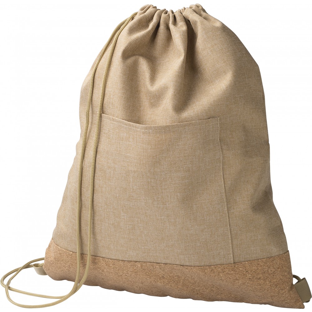 Tornazsák parafa aljjal. Elülső oldalán egy kis zseb található. 600D RPET poliészter. Emblémázás: Szitanyomás