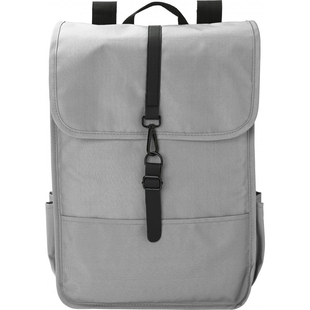 Hátizsák. Két palackzseb az oldalán, egy nagy rekesz. Fekete PU pánttal, csattal zárható. 300D RPET poliészter. Emblémázás: Szitanyomás