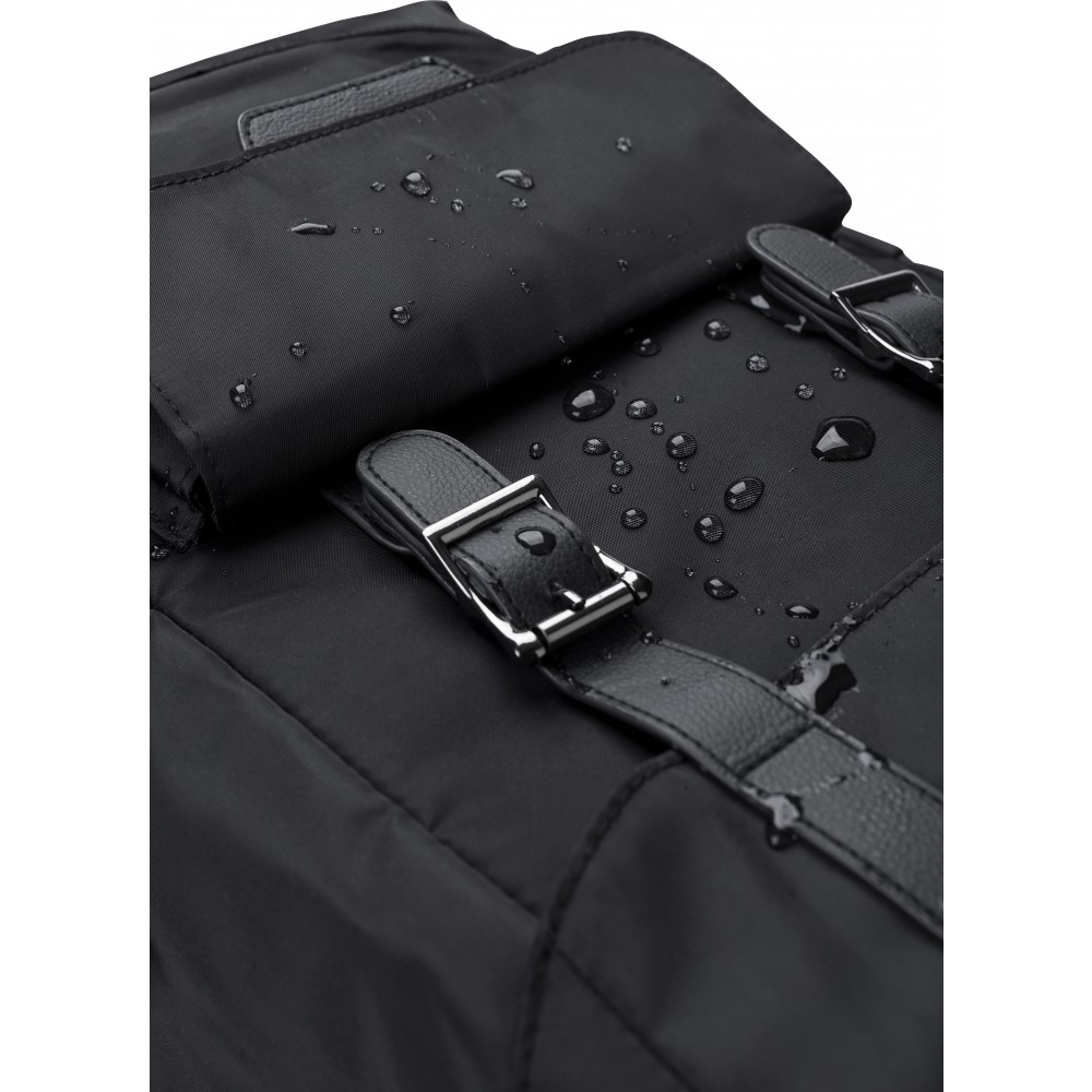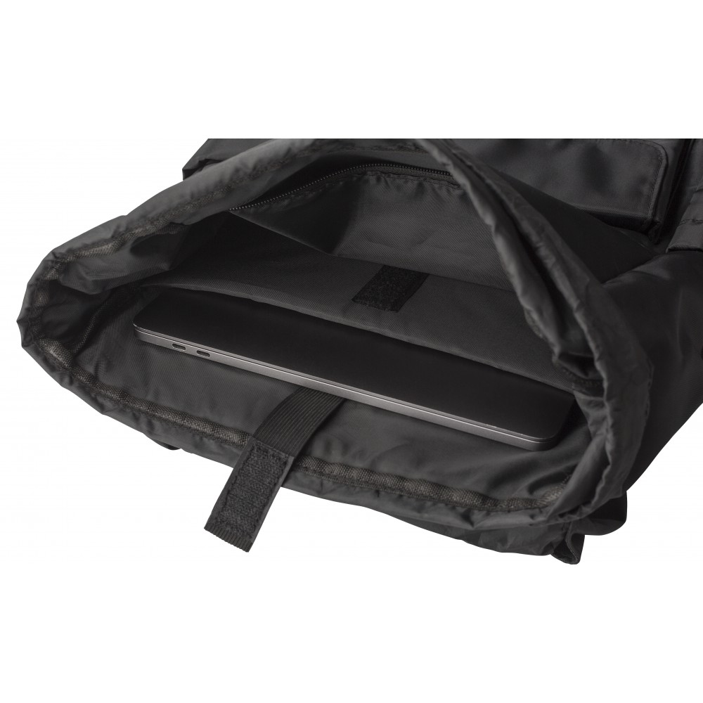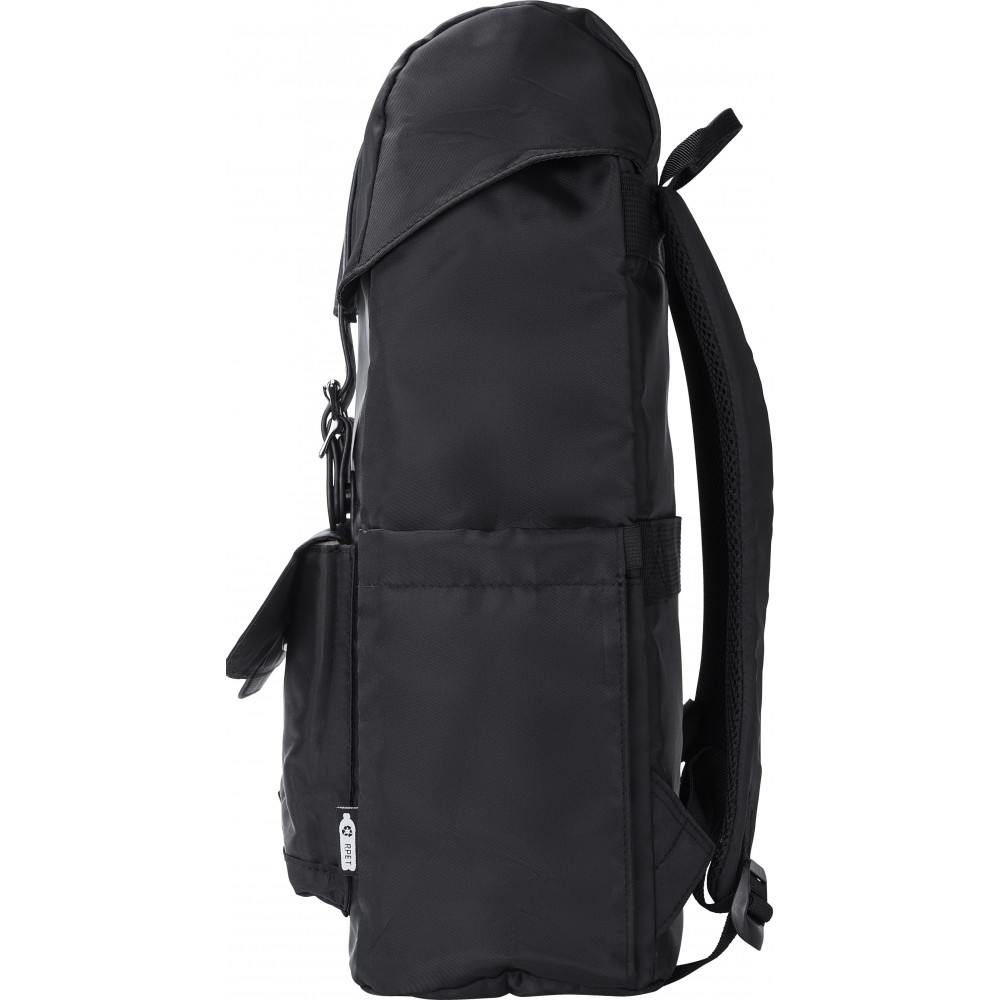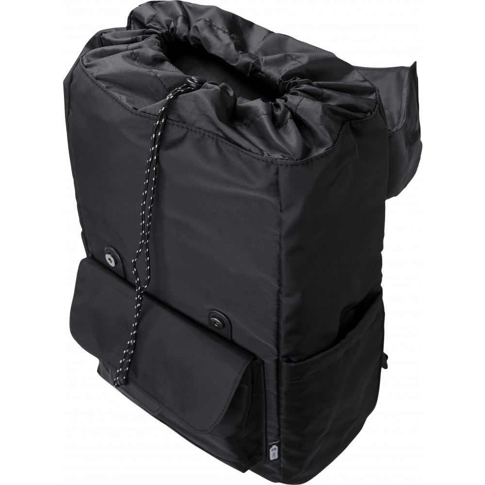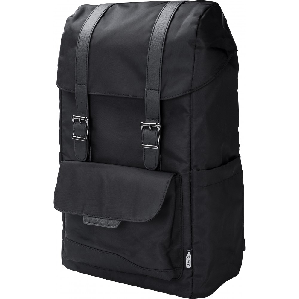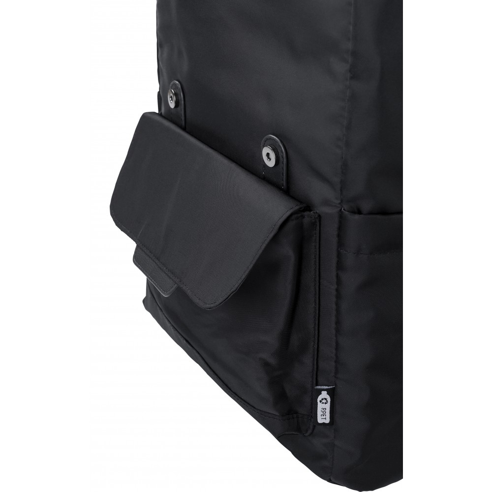 Hátizsák. Oldalt palacktartók, elöl mágneses záródású zseb. A belső zseb zsinórral zárható, belül laptoptartó és normál zseb található (15"-es laptop számára). A hátoldalon pánt található a bőrönd húzókájára való rögzítés érdekében. Vízlepergető bevonat. 290T twill poliészter RPET. Emblémázás: Szitanyomás