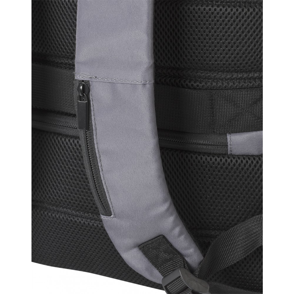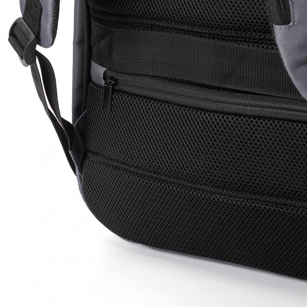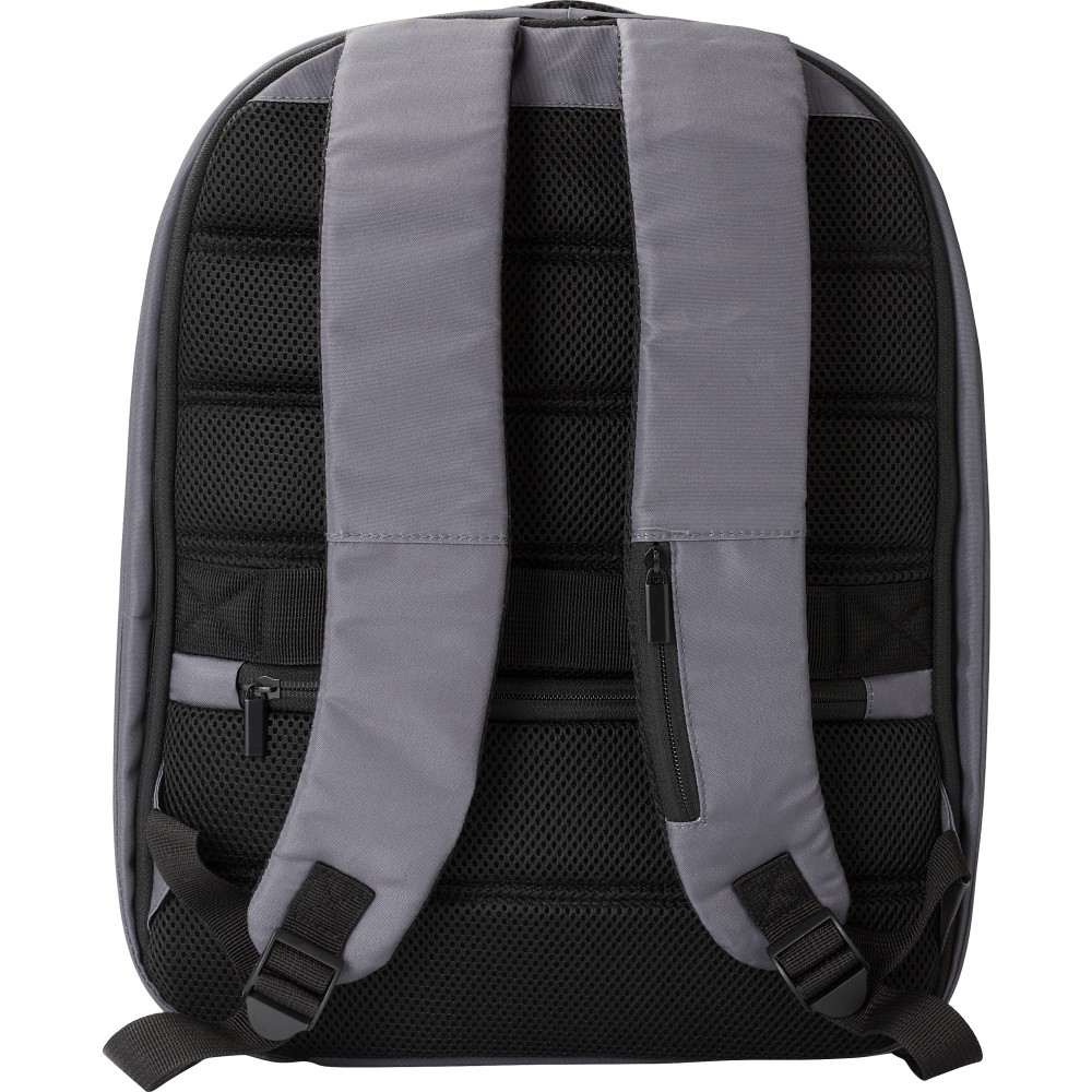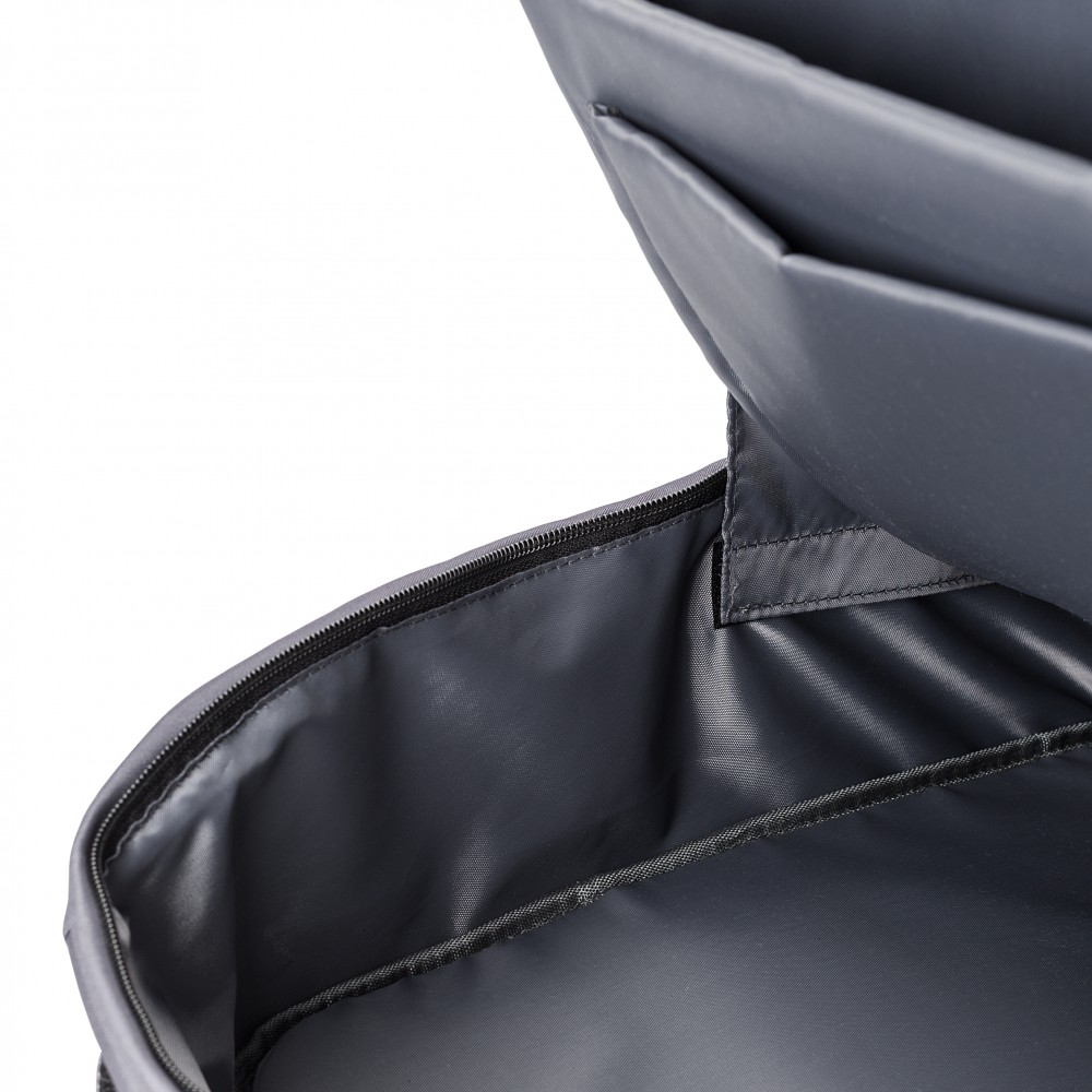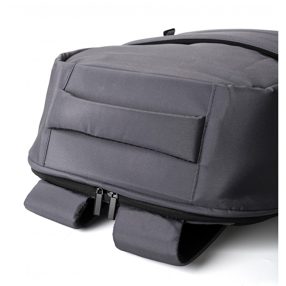 Lopásgátló laptop hátizsák egy nagy rekesszel. Hátul lopásgátló zseb. Belül két rekesz, melyek közül az egyik alkalmas 15"-es laptop számára. Párnázott hátpanel. 300D RPET poliészter. Emblémázás: Szitanyomás