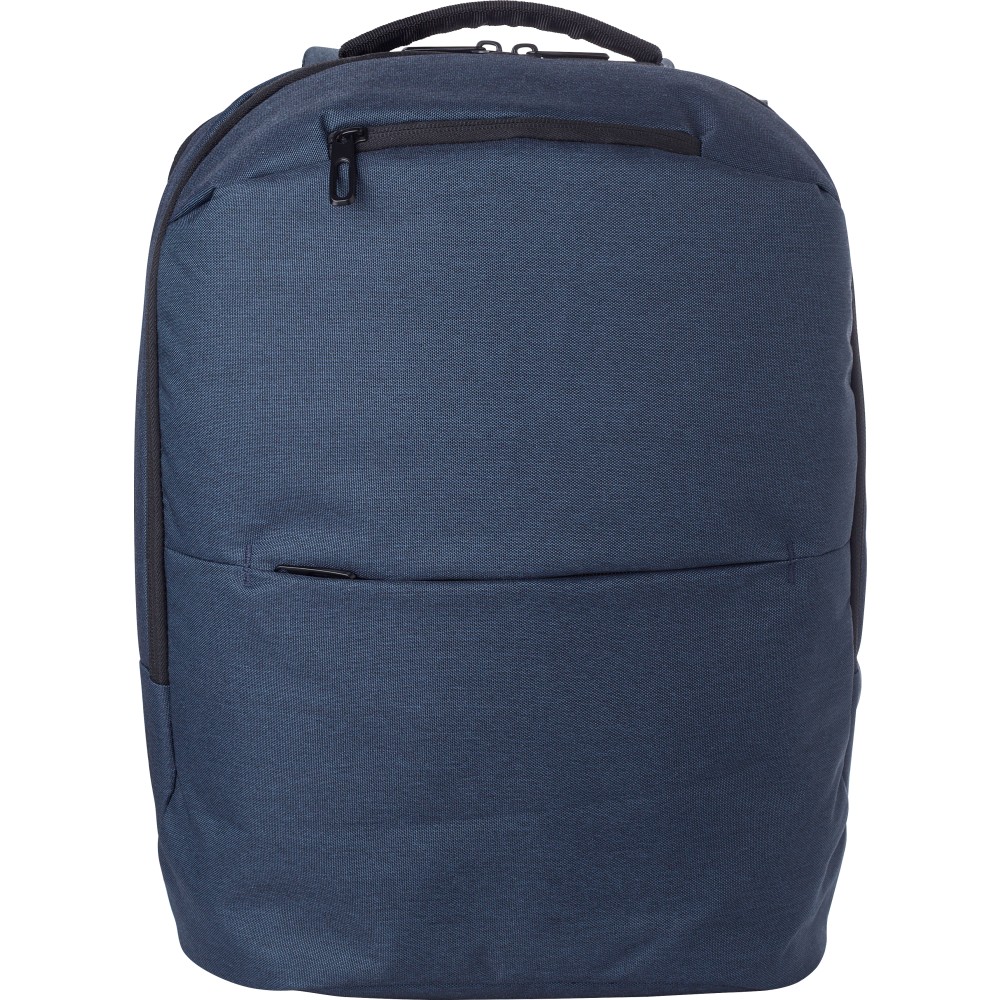 Kéttónusú poliészter (600D) hátizsák. Két cipzáras zseb az elülső oldalon és két nagy cipzáras rekesz a felső oldalon, belül egy laptoprekesz. A hátizsák megerősített, és egy pántot is tartalmaz, amellylel húzókás böröndre rögzíthető. Emblémázás: Szitanyomás
