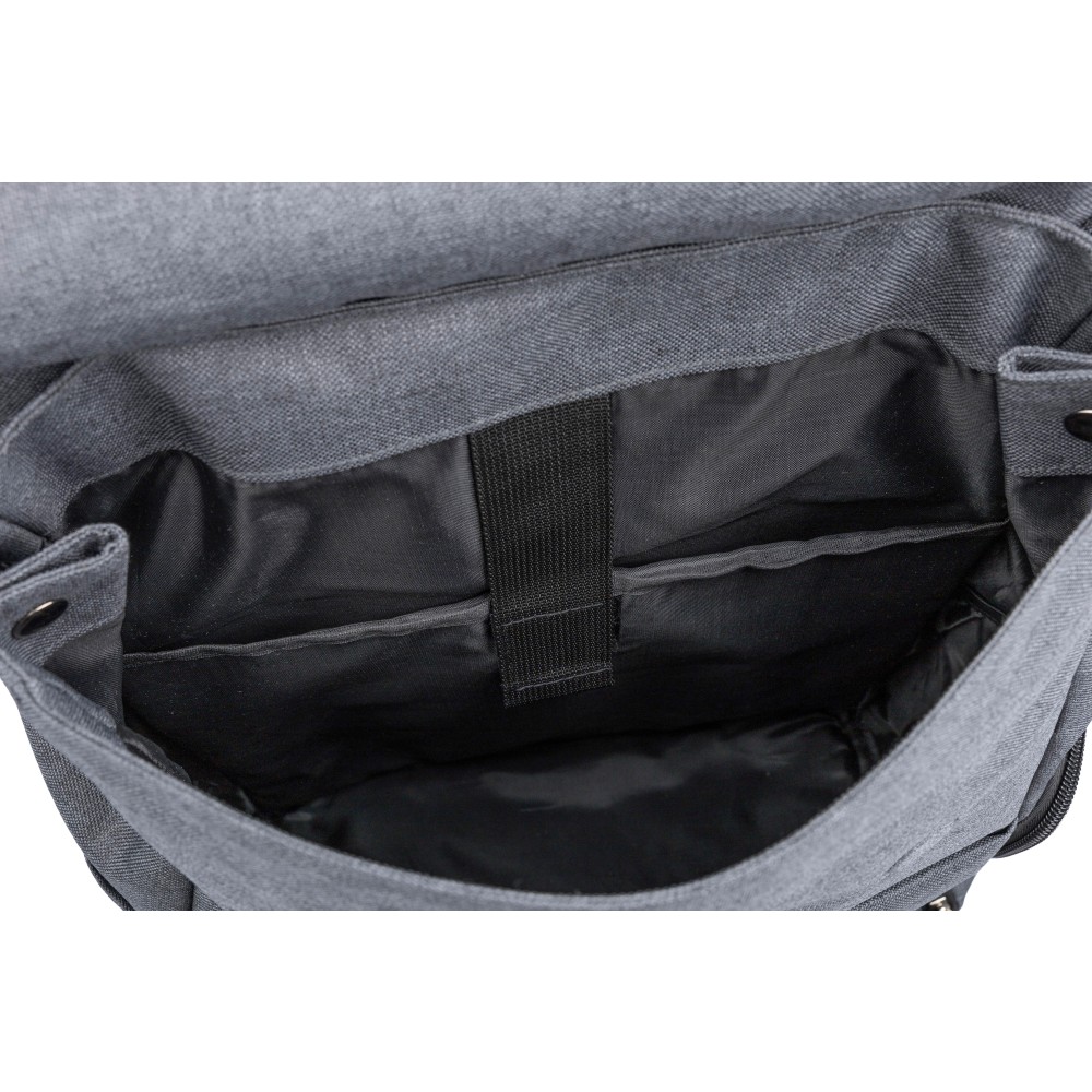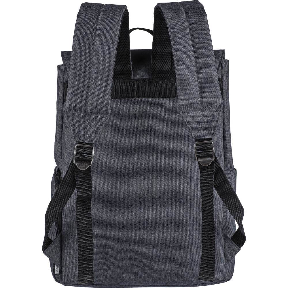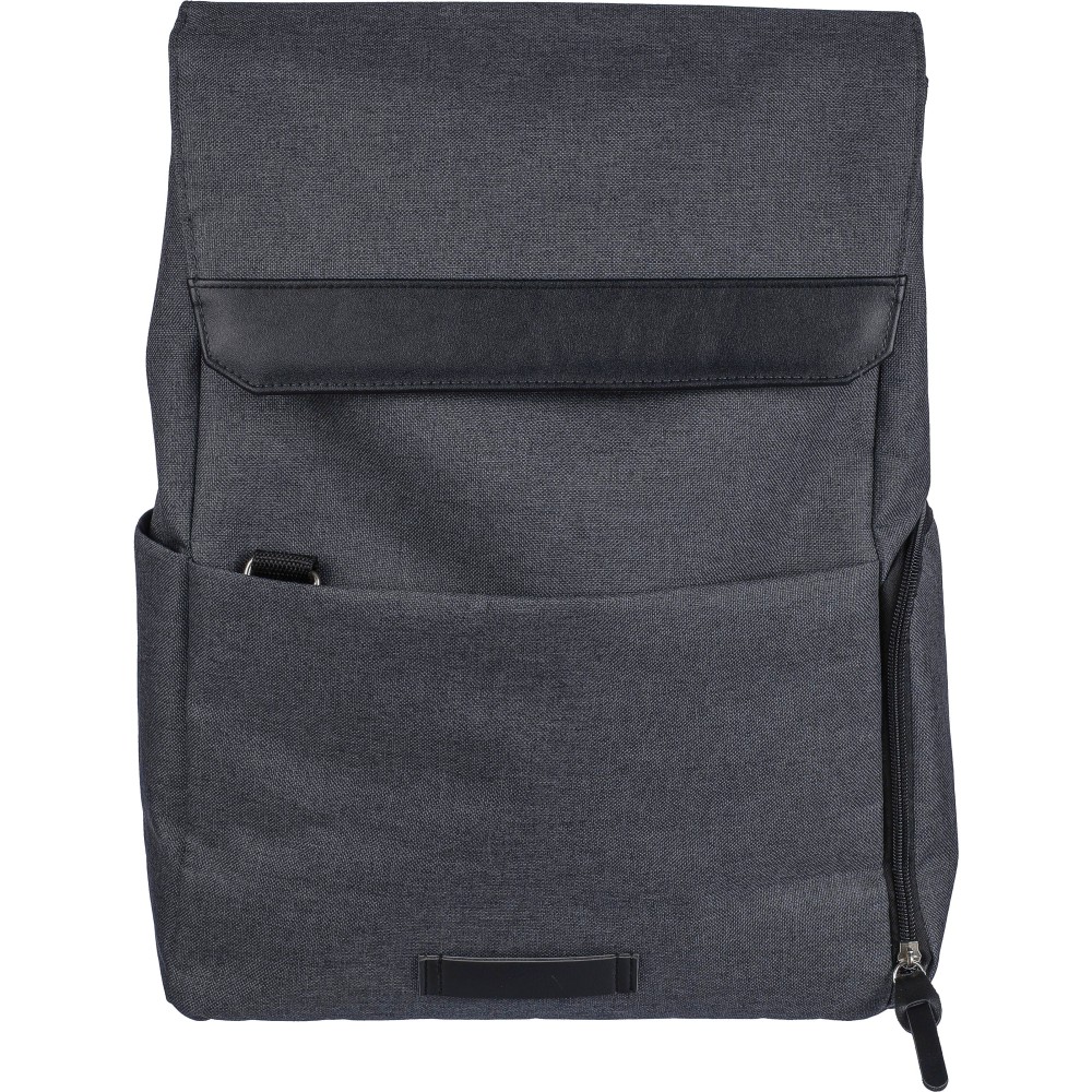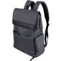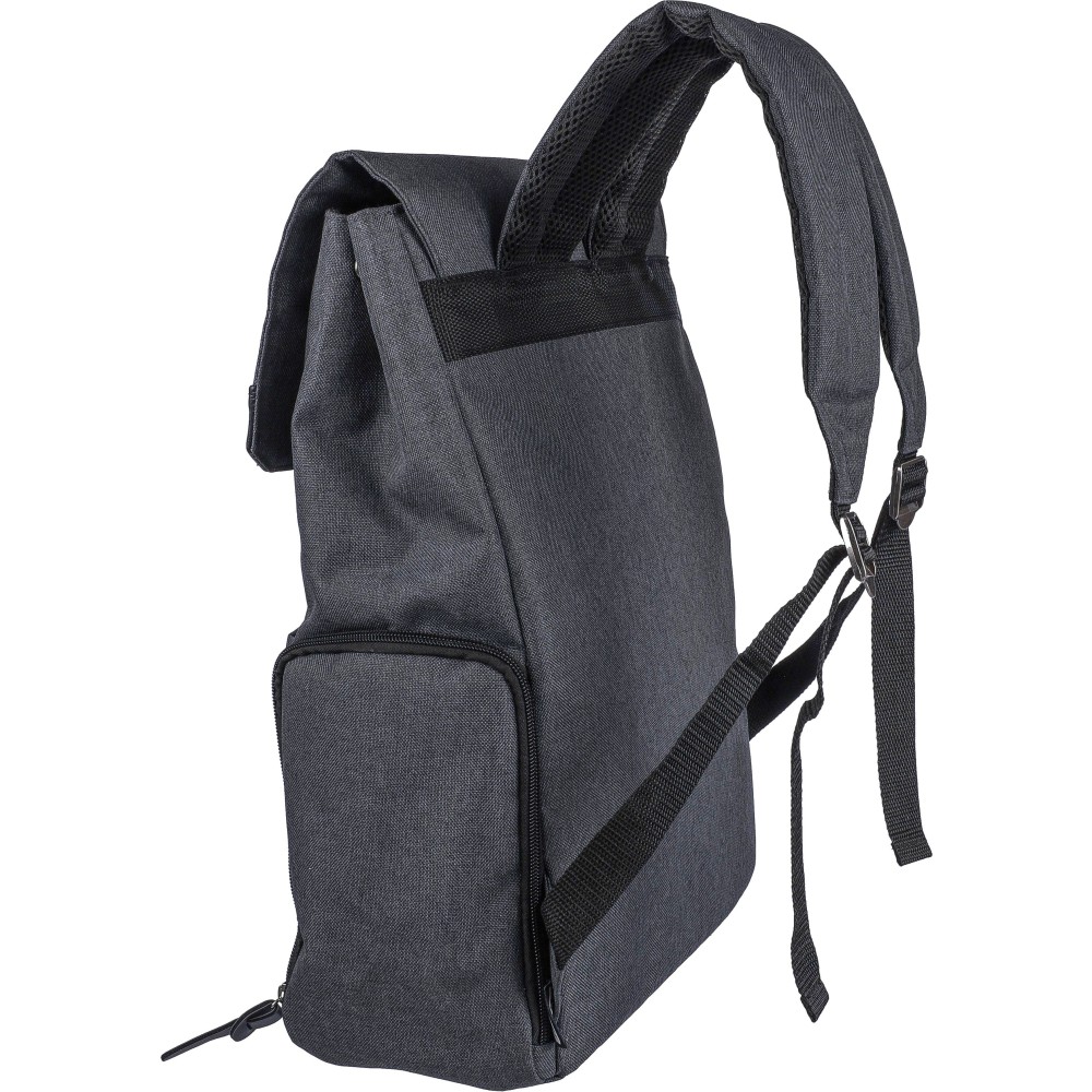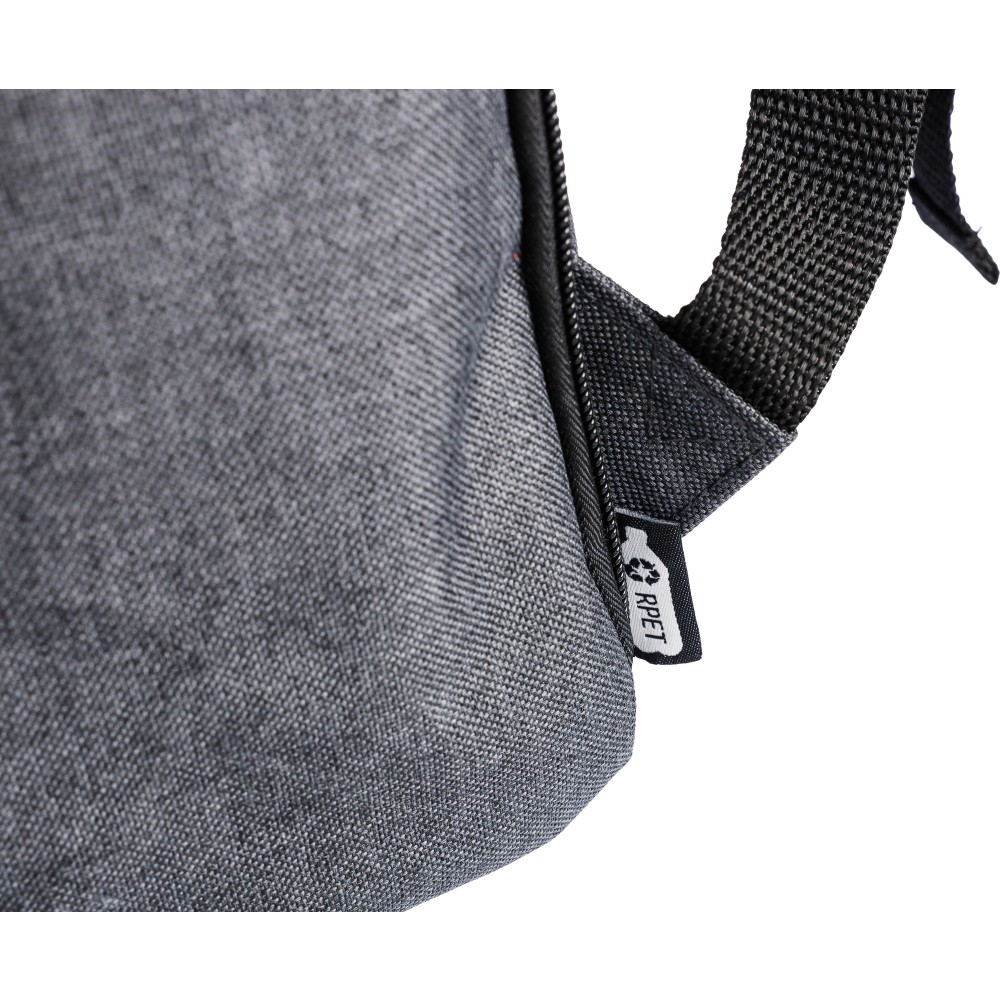 Laptophátizsák 15"-es laptop számára, PVC részletekkel és 210D béléssel. Kis cipzáras elülső zsebbel rendelkezik, benne egy kulcsokhoz rögzíthető karabinerrel, egy cipzáras oldalzsebbel, egy normál oldalzsebbel, valamint egy nagy, mágneszáras rekesszel, amely laptopzsebet tartalmaz. Oldalt nyomógombokkal zárható, ha nincs teljesen megtöltve. Állítható, szellőző pántokkal. Az elülső részen rPET anyagra utaló címke található. Anyaga: 600D poliészter vászon. Emblémázás: Szitanyomás