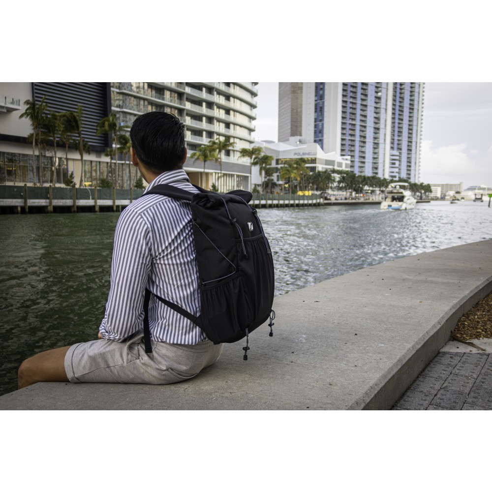 A Venturer roll-top hátizsák egyszerre stílusos és környezetbarát kiegészítő, így kiváló céges ajándék. Újrahasznosított PET-palackokból készült, és a fenntarthatóság iránti elkötelezettséget tükrözi, miközben elegáns dizájnt kínál. Tágas fő rekeszében, több sztreccs zsebében és párnázott laptoprekeszében, melyben 16"-es laptop is elfér, bőséges tárolást biztosít a legfontosabb dolgoknak. A könnyű és helytakarékos Venturer ideális ingázáshoz, utazáshoz vagy hétköznapi kirándulásokhoz. Jellemzők: állítható vállpánt, roll-top záródás, szellőző vállpántok, valamint víz- és folttaszító anyag. Emblémázás: Hímzés