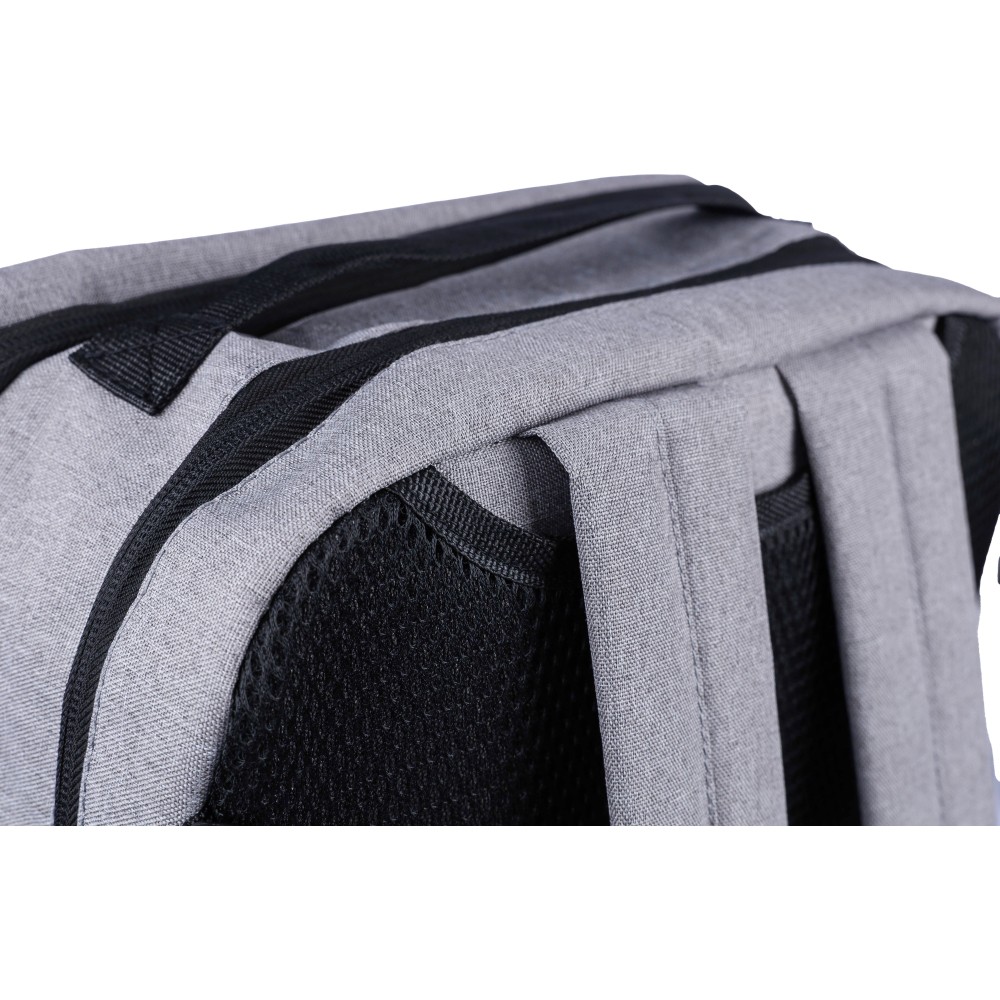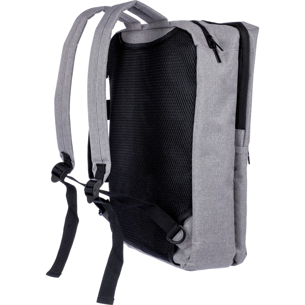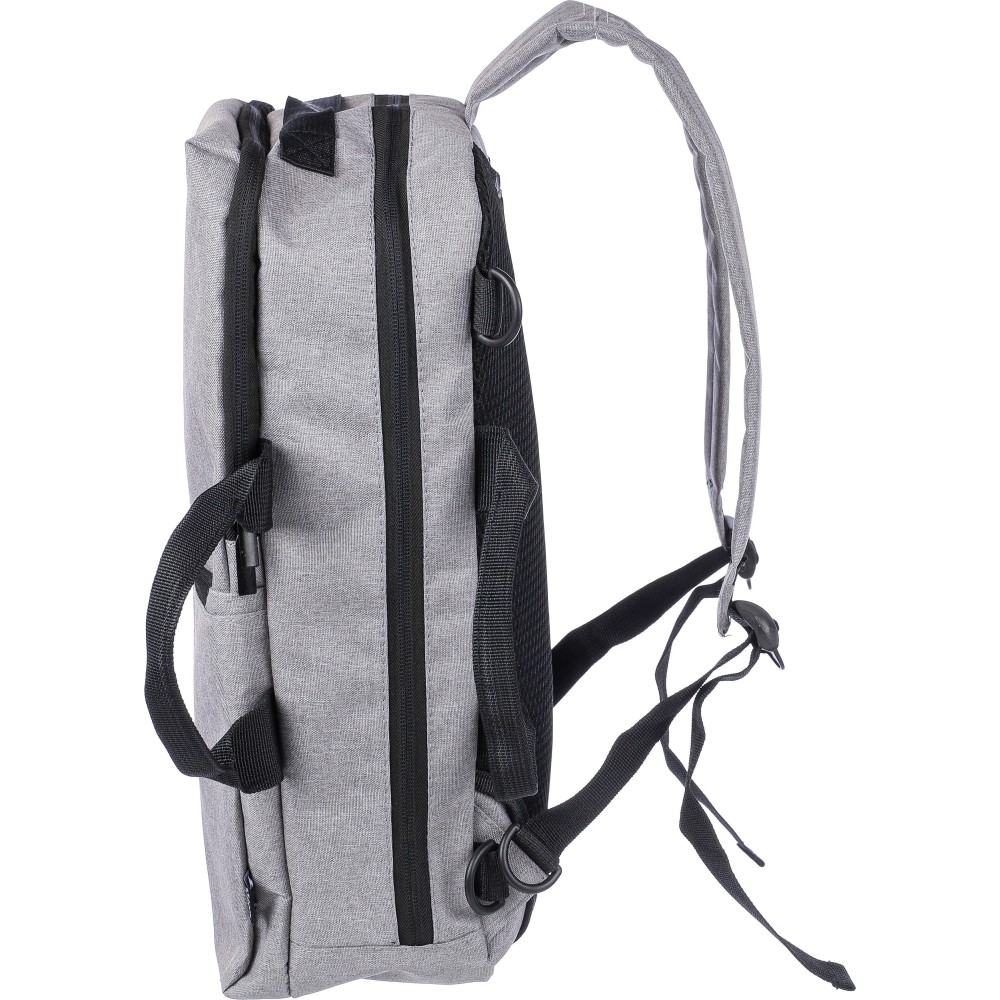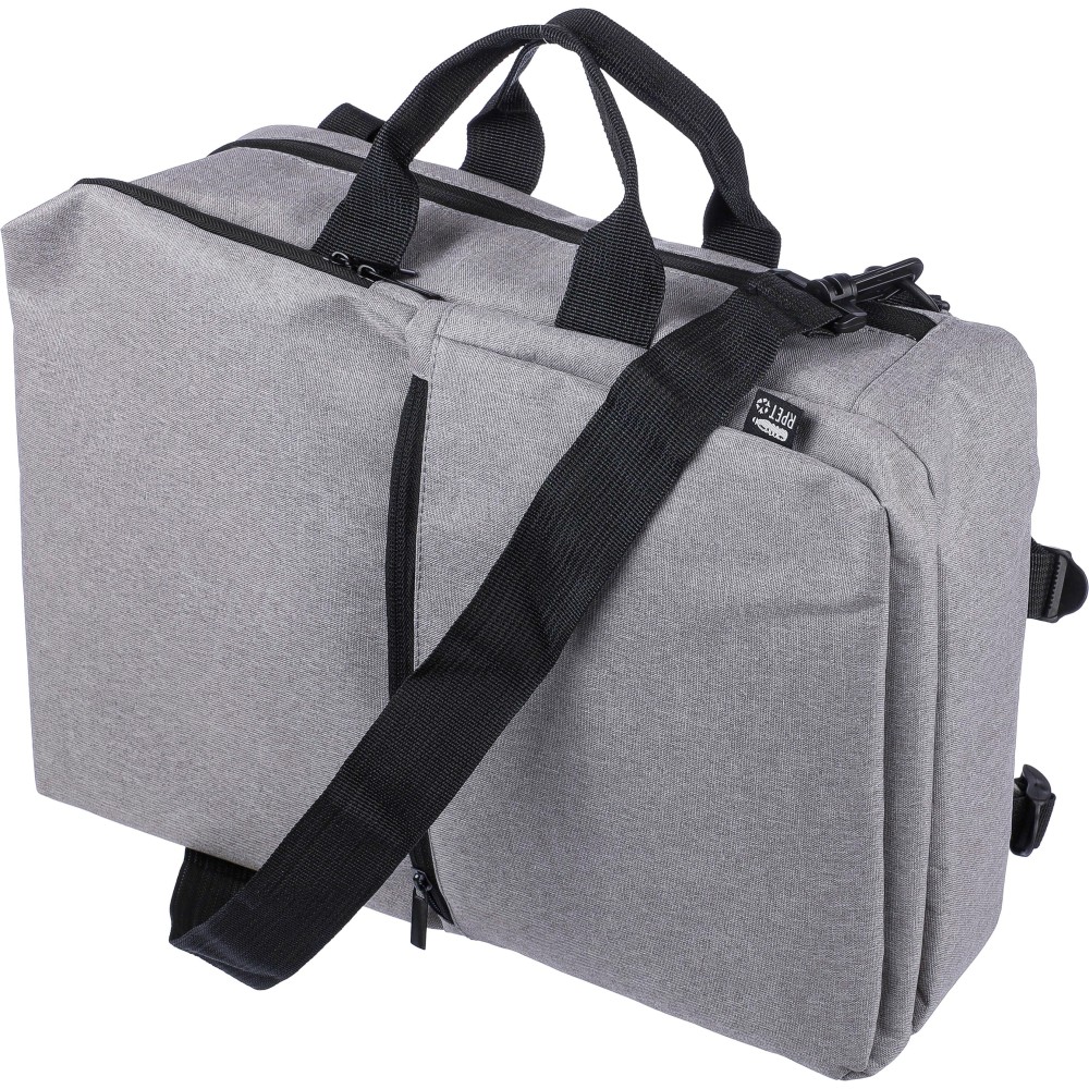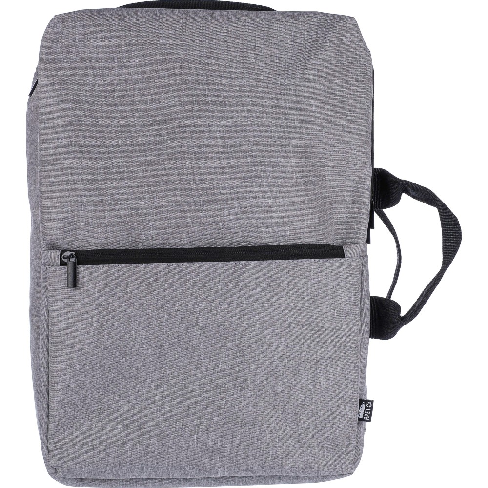 Hátizsák és laptoptáska 15"-es készülékhez. Kézipoggyász méretű. Hordozófüllel a tetején, állítható vállpántokkal és két oldalsó fogantyúval. Az állítható pántok a párnázás mögé rejthetők, így az oldalsó fogantyúkkal is hordozható. Tépőzáras laptoprekesszel és kis cipzáras zsebbel rendelkezik. Szellőző, párnázott hátoldallal. Terhelhetősége kb. 8 kg. RPET alapanyagra utaló címkével. Anyaga: 300D RPET poliészter. Emblémázás: Hímzés, Szitanyomás
