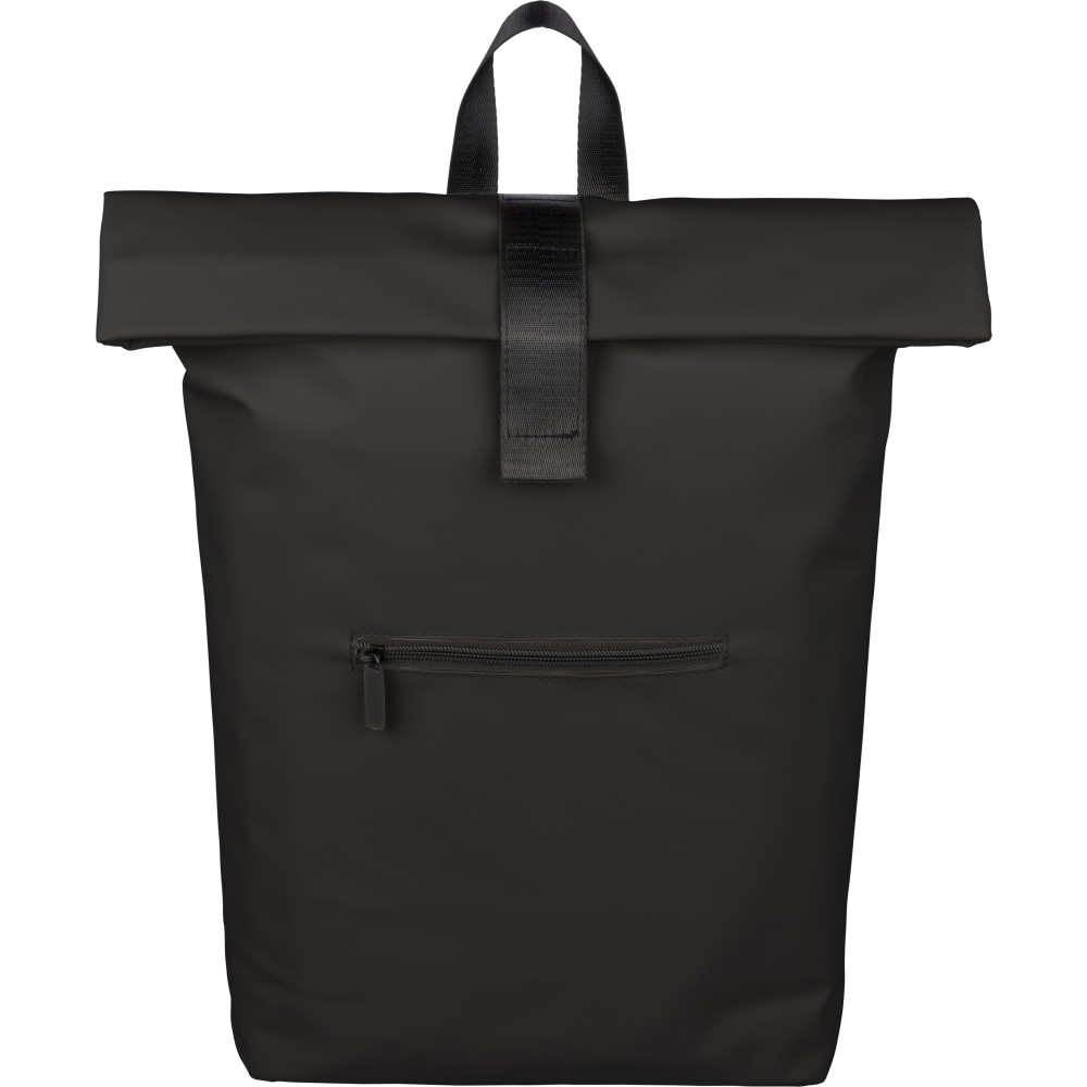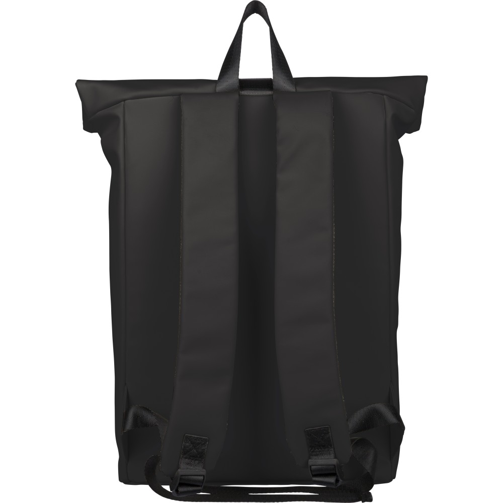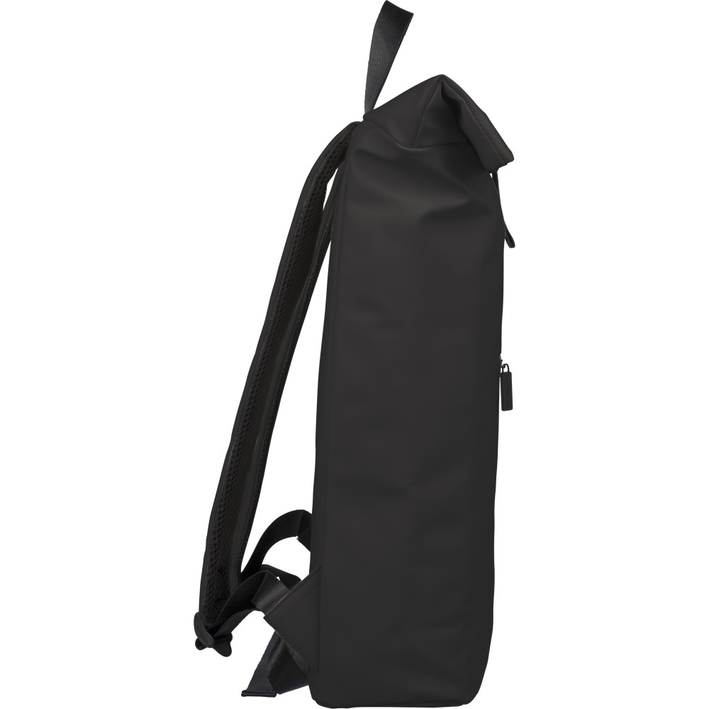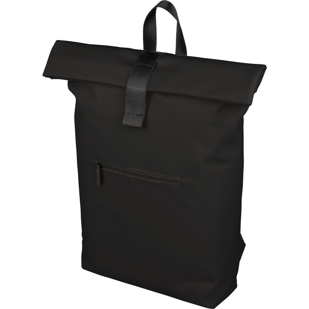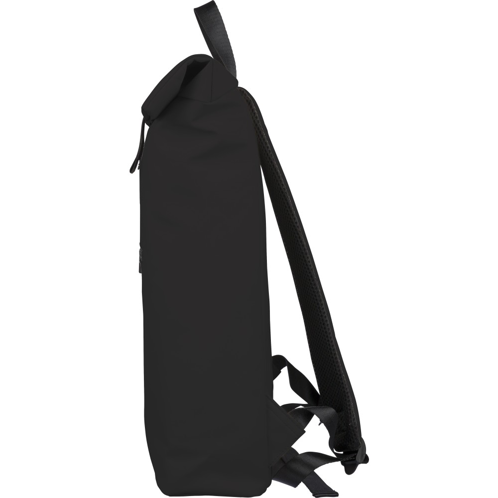 Újrahasznosított PU anyagból készült hátizsák 19 literes űrtartalommal, rolltop záródással és tépőzáras rögzítéssel. Elülső cipzáras zsebbel, 16 hüvelykes laptoprekesszel, 210D újrahasznosított béléssel, állítható szellőző vállpántokkal és felső fogantyúval rendelkezik. A belső címkén újrahasznosított alapanyagra utaló jelölés található. Emblémázás: Szitanyomás