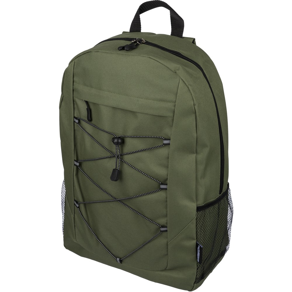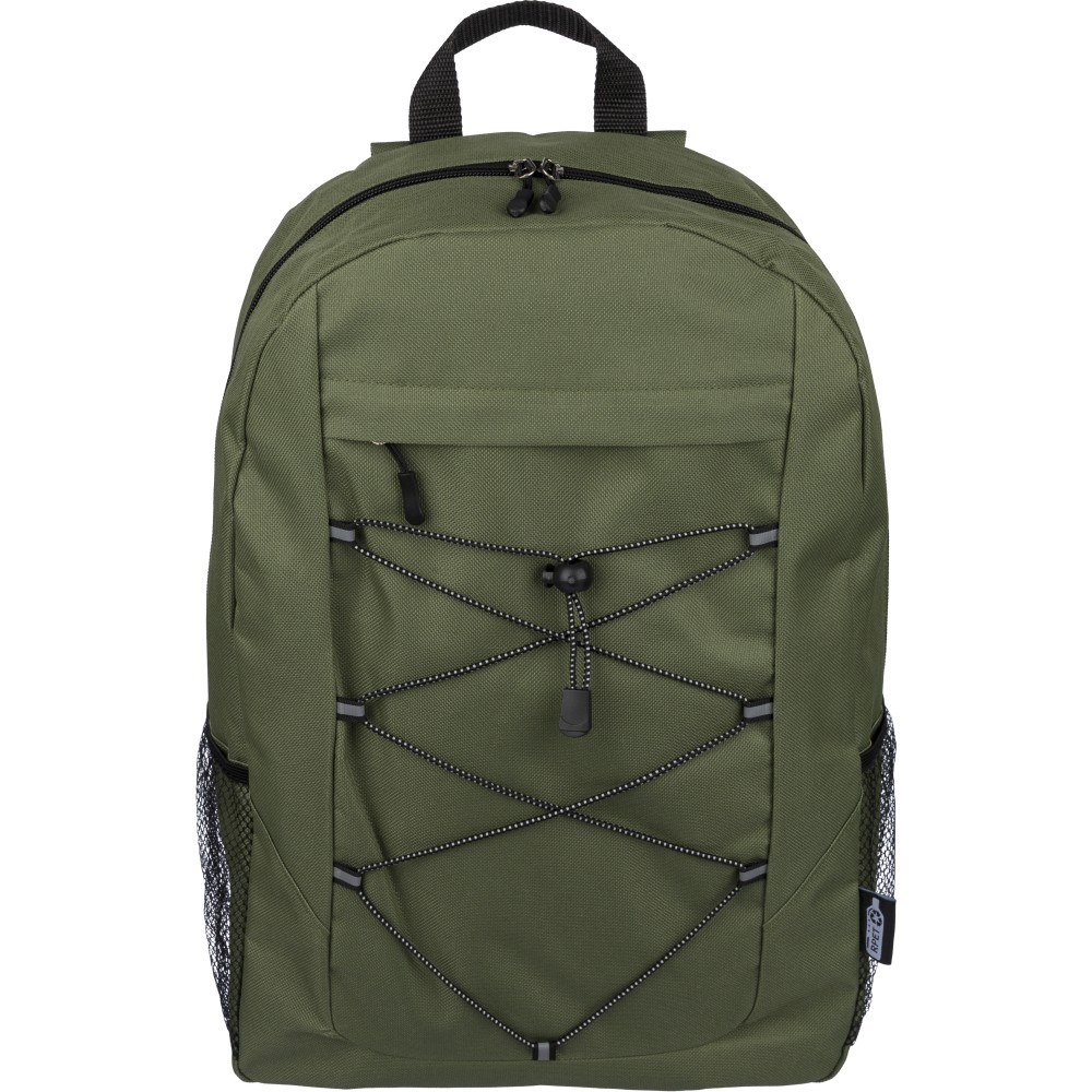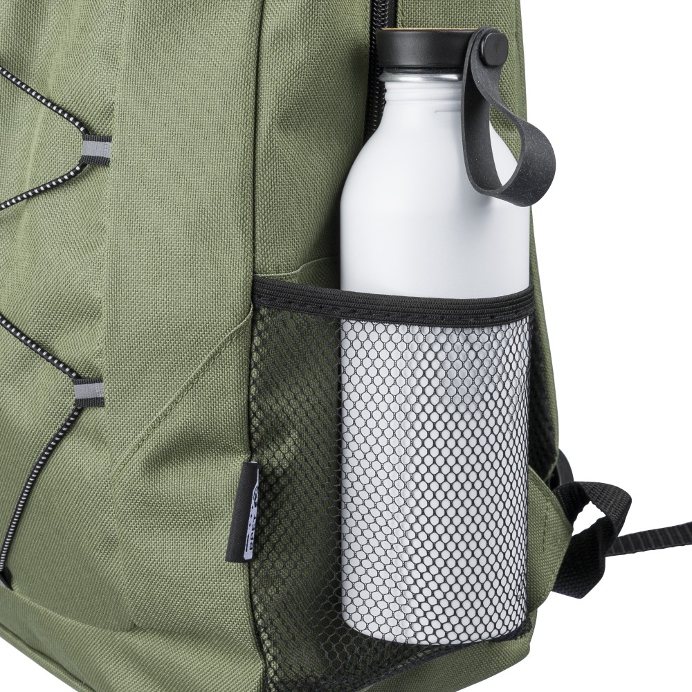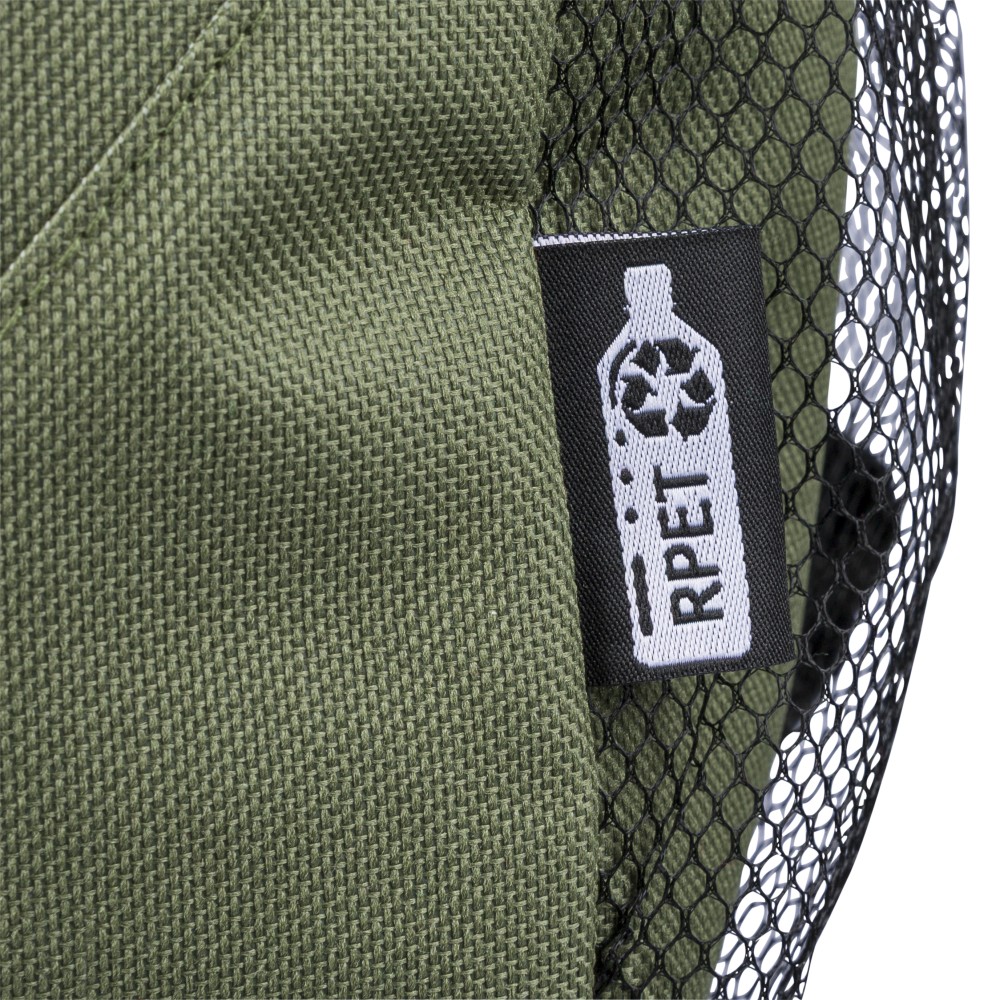 RPET poliészter 600D anyagból készült hátizsák húzózsinóros záródással és nagy cipzáras fő rekesszel. Hálós oldalzsebekkel, rugalmas elülső pántokkal, dekorációhoz kialakított kis elülső cipzáras zsebbel és állítható vállpántokkal rendelkezik. A terméken rPET alapanyagra utaló címke található. Emblémázás: Szitanyomás