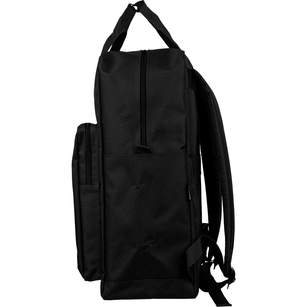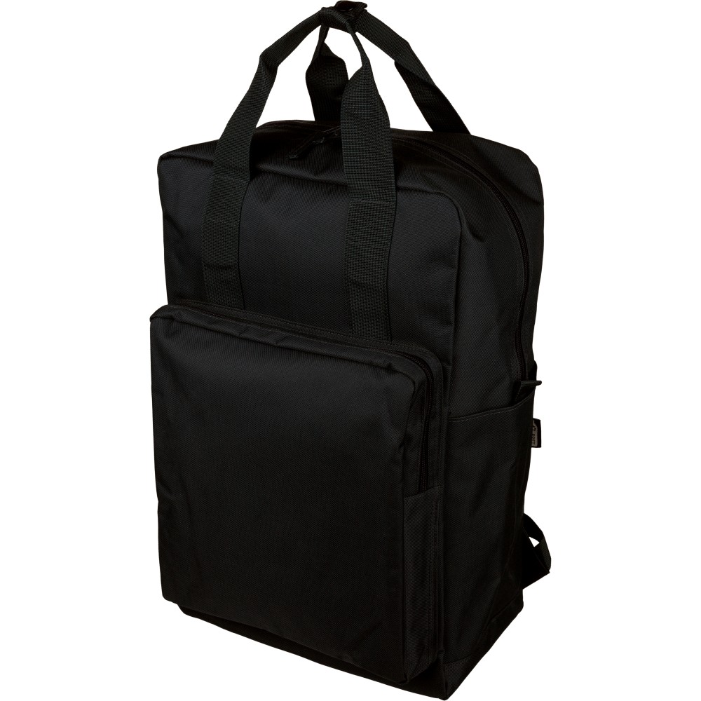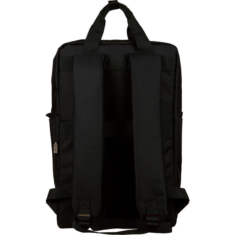 Újrahasznosított 900D poliészterből készült hátizsák, 210D béléssel és rPET címkével. Tágas fő rekesszel rendelkezik, 16?-os laptop számára kialakított külön zsebbel, elülső rekesszel, két oldalzsebbel, valamint bőröndre rögzíthető pánttal (trolley strap). Felső fogantyúi gombbal összefoghatóak, vállpántjai szellőző kialakításúak a kényelmes viselet érdekében. Emblémázás: Szitanyomás