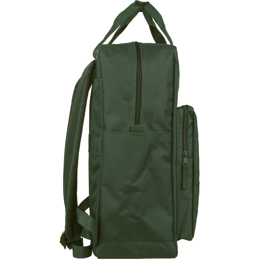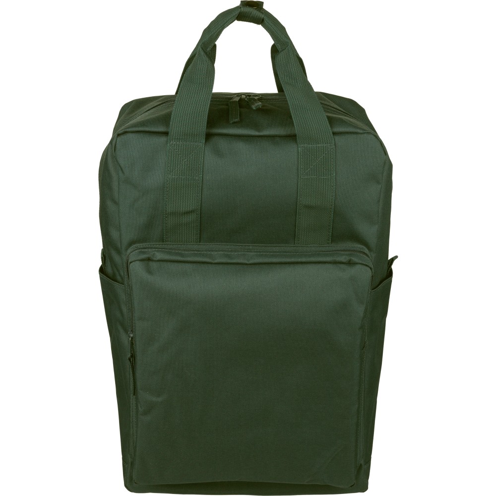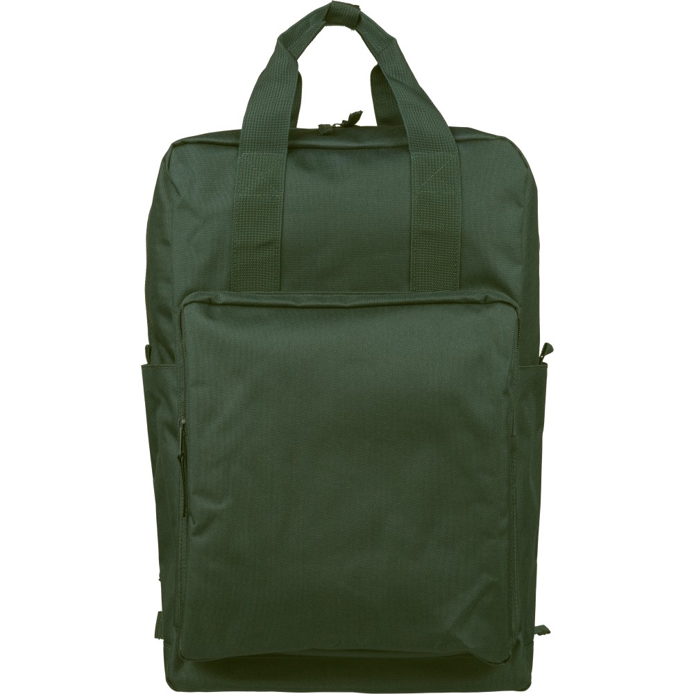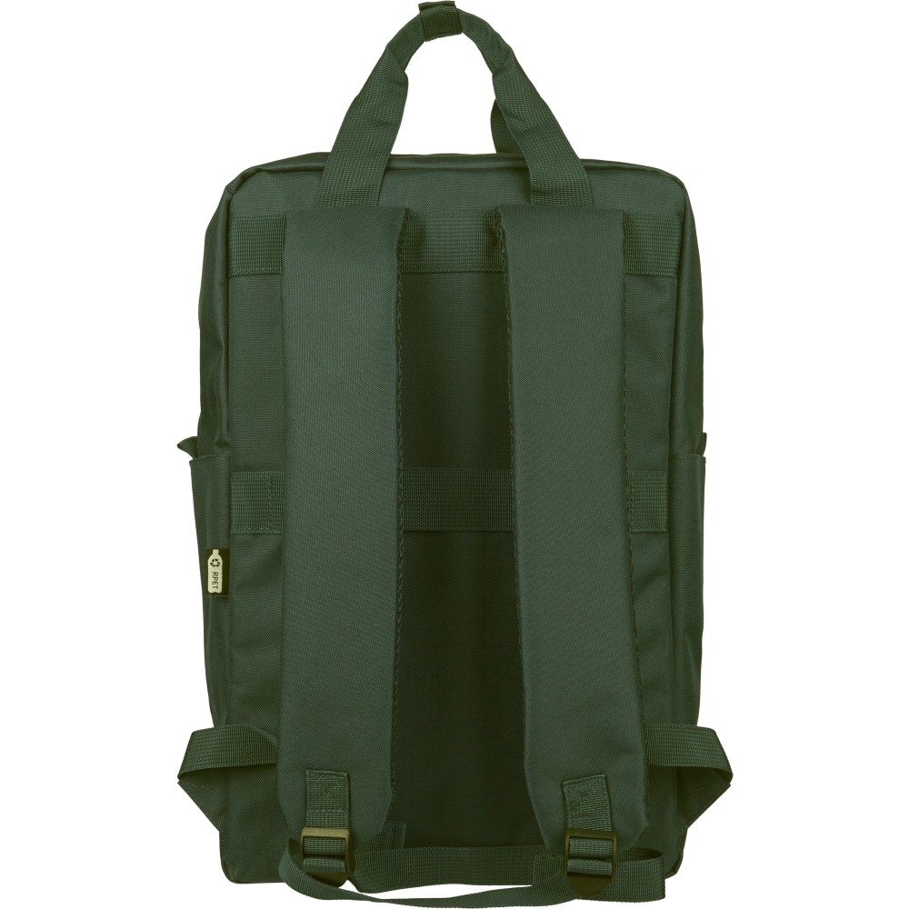 Újrahasznosított 900D poliészterből készült hátizsák, 210D béléssel és rPET címkével. Tágas fő rekesszel rendelkezik, 16?-os laptop számára kialakított külön zsebbel, elülső rekesszel, két oldalzsebbel, valamint bőröndre rögzíthető pánttal (trolley strap). Felső fogantyúi gombbal összefoghatóak, vállpántjai szellőző kialakításúak a kényelmes viselet érdekében. Emblémázás: Szitanyomás