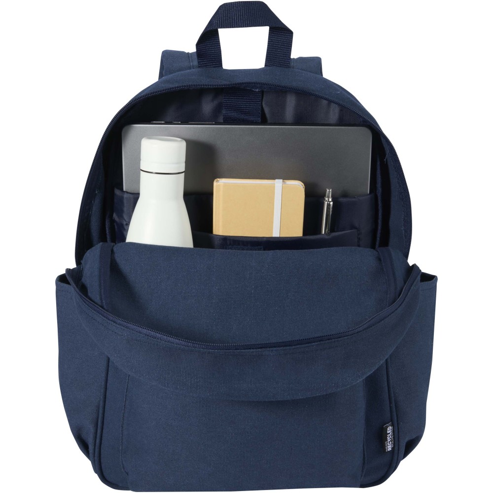 A Recanvas városi hátizsák GRS tanúsítvánnyal rendelkező, újrahasznosított és vízlepergető vászonból készült, színben harmonizáló RPET béléssel. A 16 literes űrtartalmú táska egy párnázott, 15,6"-os laptoprekesszel és egy további párnázott tárolórekesszel rendelkezik, emellett egy cipzáras elülső zsebbel, két oldalsó zsebbel, légáteresztő hálós hátrésszel és a kényelmes viseletet biztosító állítható vállpántokkal. Kialakítása révén ideális választás ingázáshoz, iskolába vagy egyéb napi használatra. Emblémázás: Szitanyomás