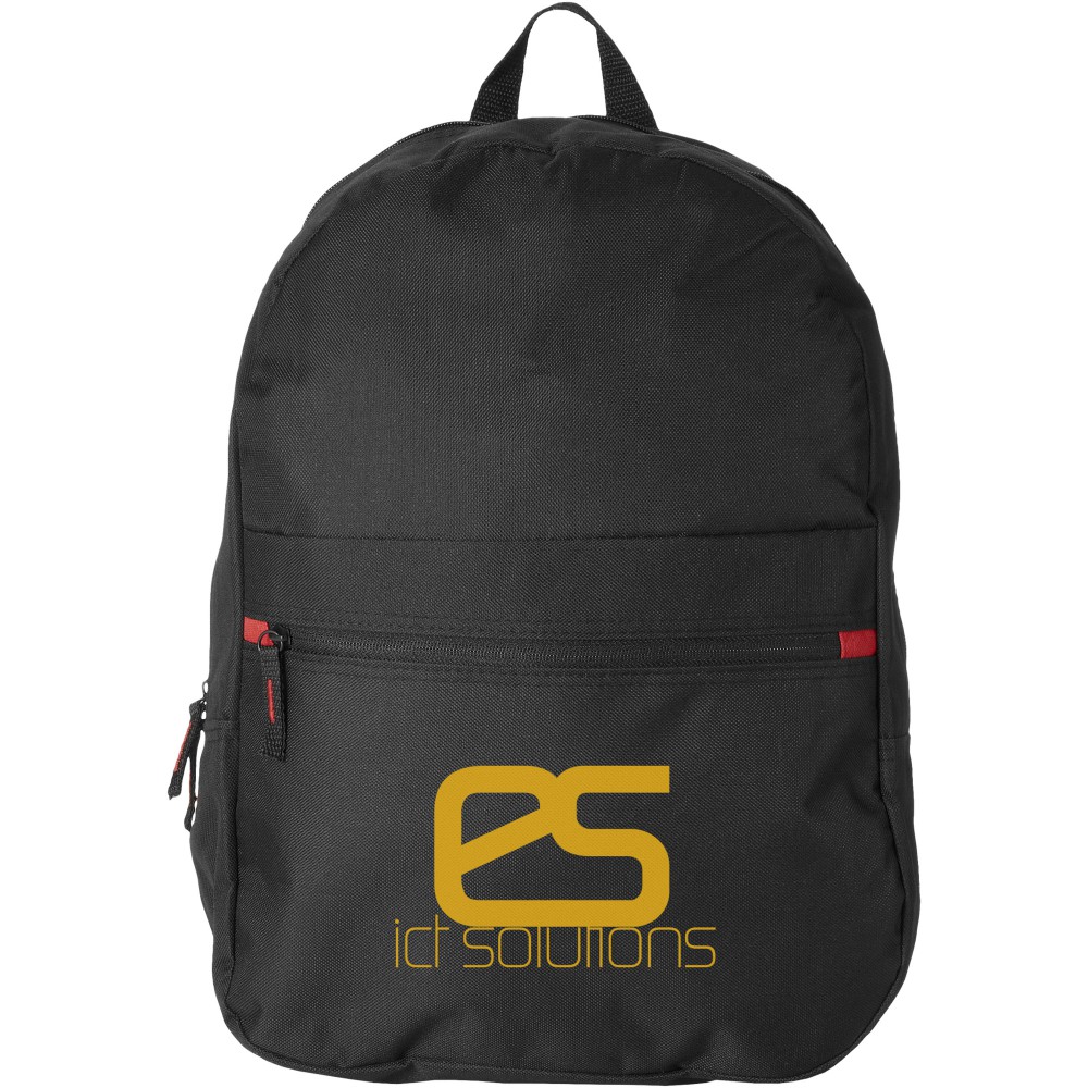 Hátizsák piros díszítésekkel, cipzáras fő rekesz, elülső cipzáras zseb és elülső zseb tépőzárral. Állítható párnázott válllpántok és megerősített felső hordfogantyú. 600D poliészter. Emblémázás: Szitanyomás