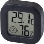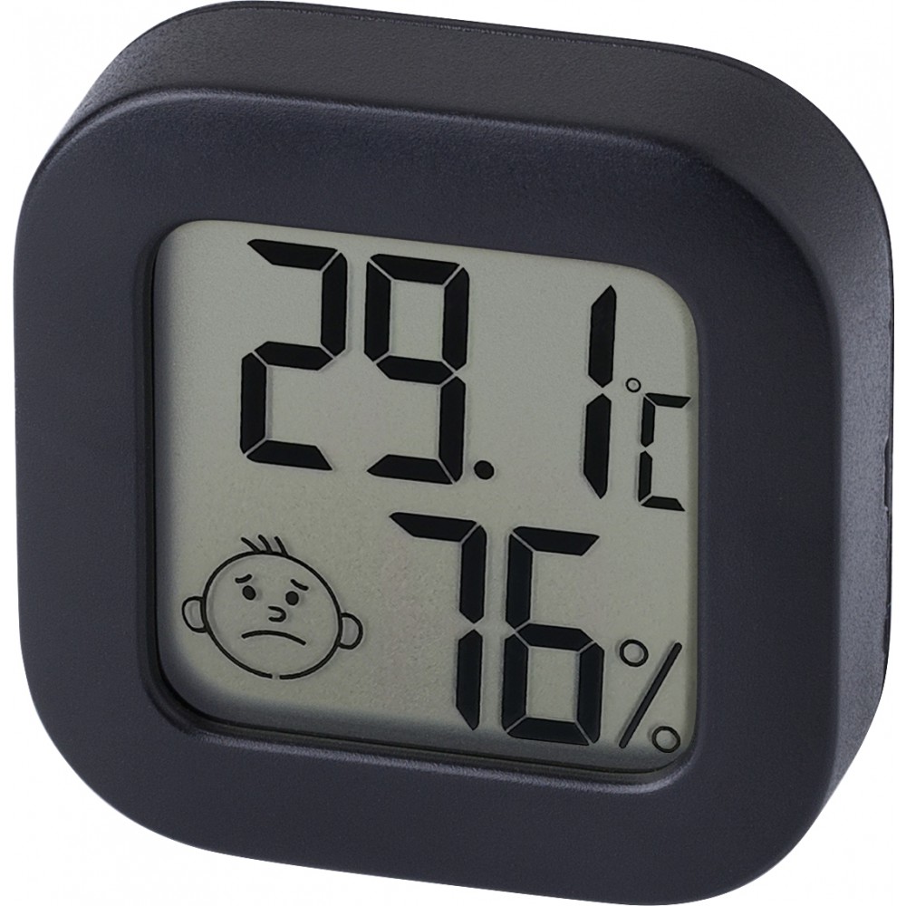 Kis higrométer (kb. 4 cm), amely az aktuális hőmérsékletet és páratartalmat mutatja. Kitámasztható. Az elemeket tatalmazza. Darabonként fehér dobozba csomagolva árkezik. ABS műanyag. Emblémázás: Tamponnyomás