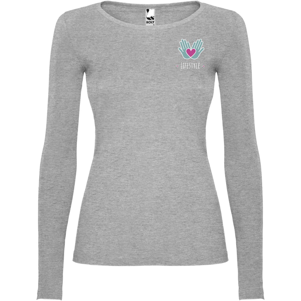 Hosszúujjú, oldalvarott, enyhén karcsúsított női póló 4 rétegű, kerek, keskeny nyakkal. Nincs ujj- és aljpasszé. Megerősített nyaki varrások. A férfi modell körkötött, a gyermek és női modell oldalvarrott. Szürke szín: 85% pamut és 15% viszkóz, 160 g/m2. Egyéb színek: 100% pamut, 160 g/m2. Emblémázás: Hímzés, Szitanyomás