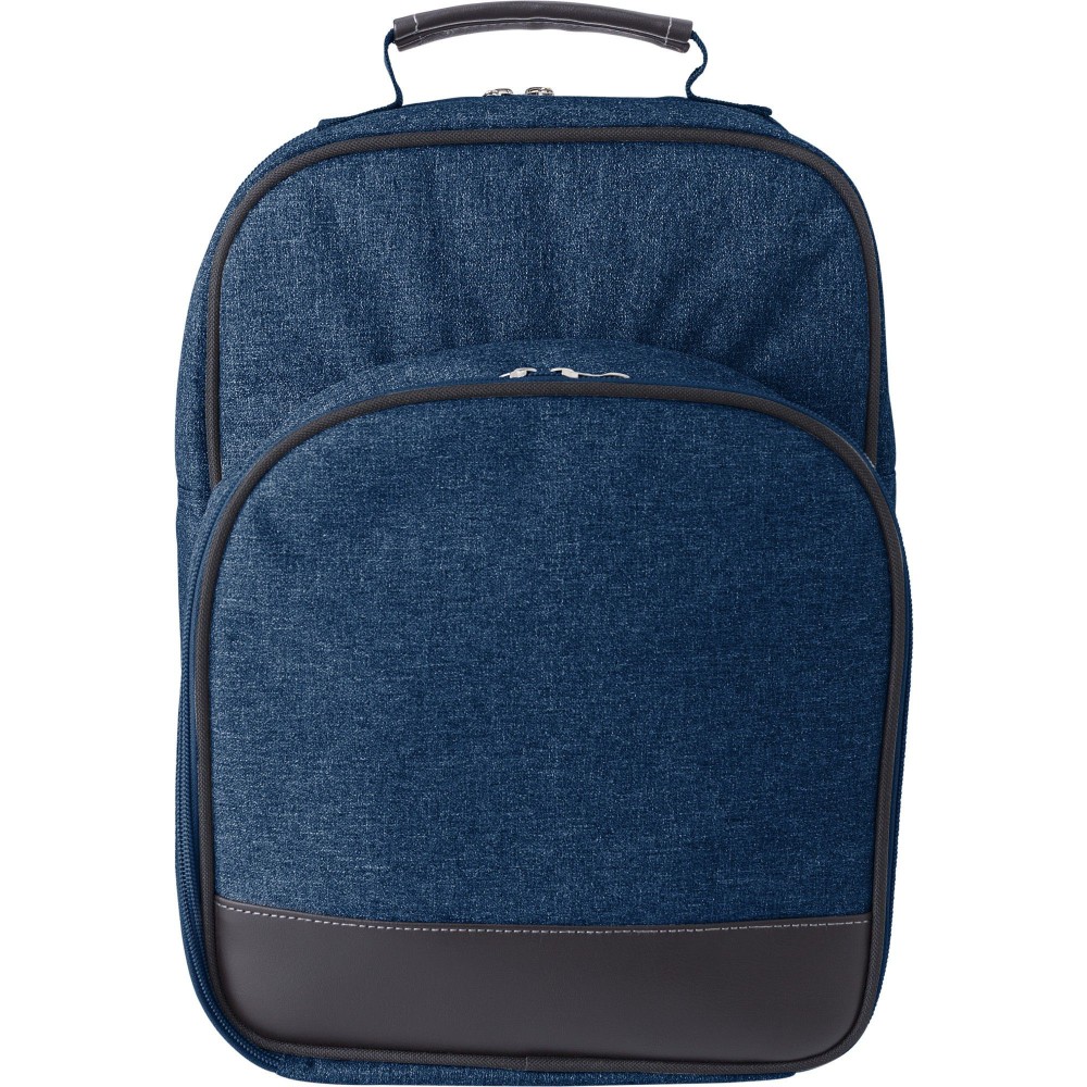 Piknik hűtőhátizsák alumínium fólia béléssel, 2 személyes. Egy nagy főrész, egy cipzáros elsőzseb evőeszközökkel és tányérokkal, állítható vállpánt. 600D művászon. Emblémázás: Szitanyomás