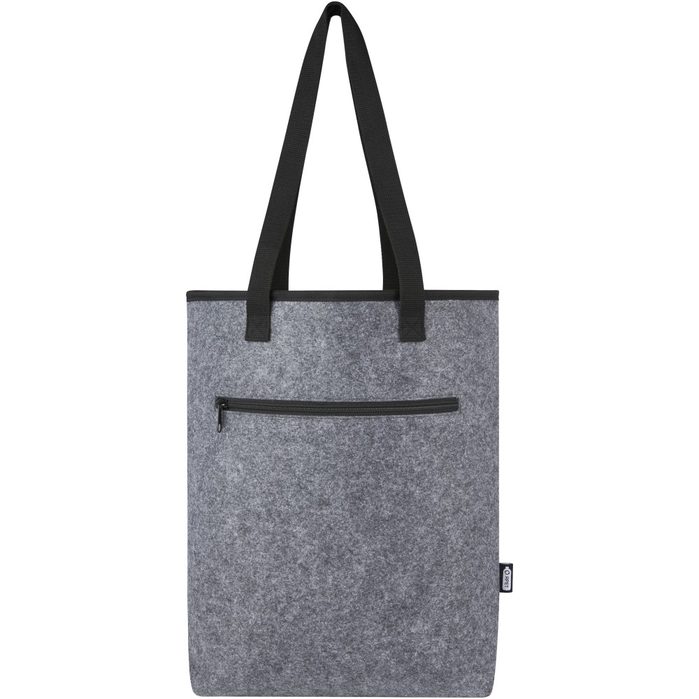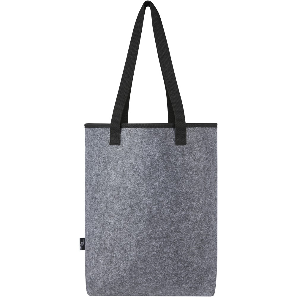 Stílusos hűtőtáska kiváló minőségű puha és tartós, GRS tanúsítvánnyal rendelkező újrahasznosított filcből. Élelmiszerbiztonságos alumínium szigeteléssel bélelt nagy főrekesz, felső oldali tépőzárral zárható, így az italokat, frissítőket és fagyasztott termékeket hosszabb ideig hűvösen és külső hatásoktól védve tartja. Hosszú, szőtt, pamut fogantyúkkal (30 x 2,5 cm), extra széles alsórésszel és cipzáras elülső zsebbel. Akár strandra megy, élelmiszert vásárolni, vagy egyszerűen csak eltölteni egy napot a szabadban a barátokkal és a családdal, ez a táska megtakarítja. GRS tanúsítvánnyal rendelkező újrahasznosított poliészter. Emblémázás: Hímzés, Szitanyomás