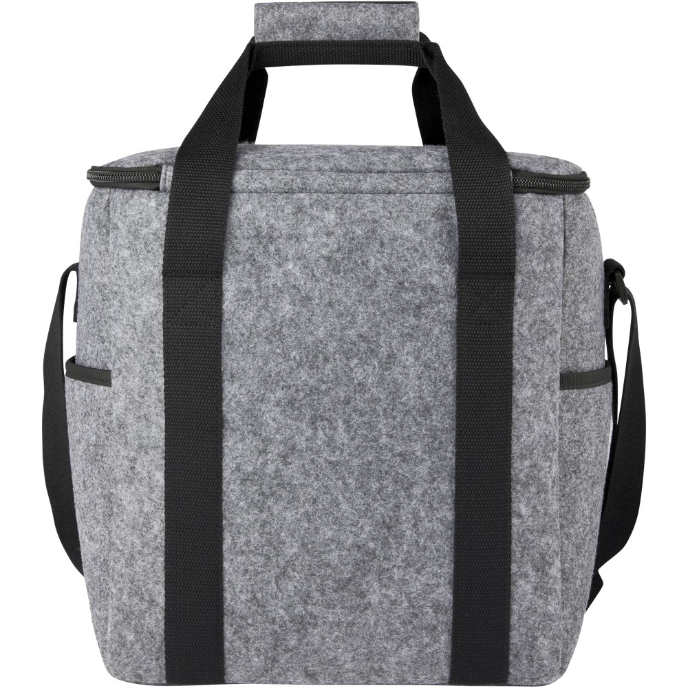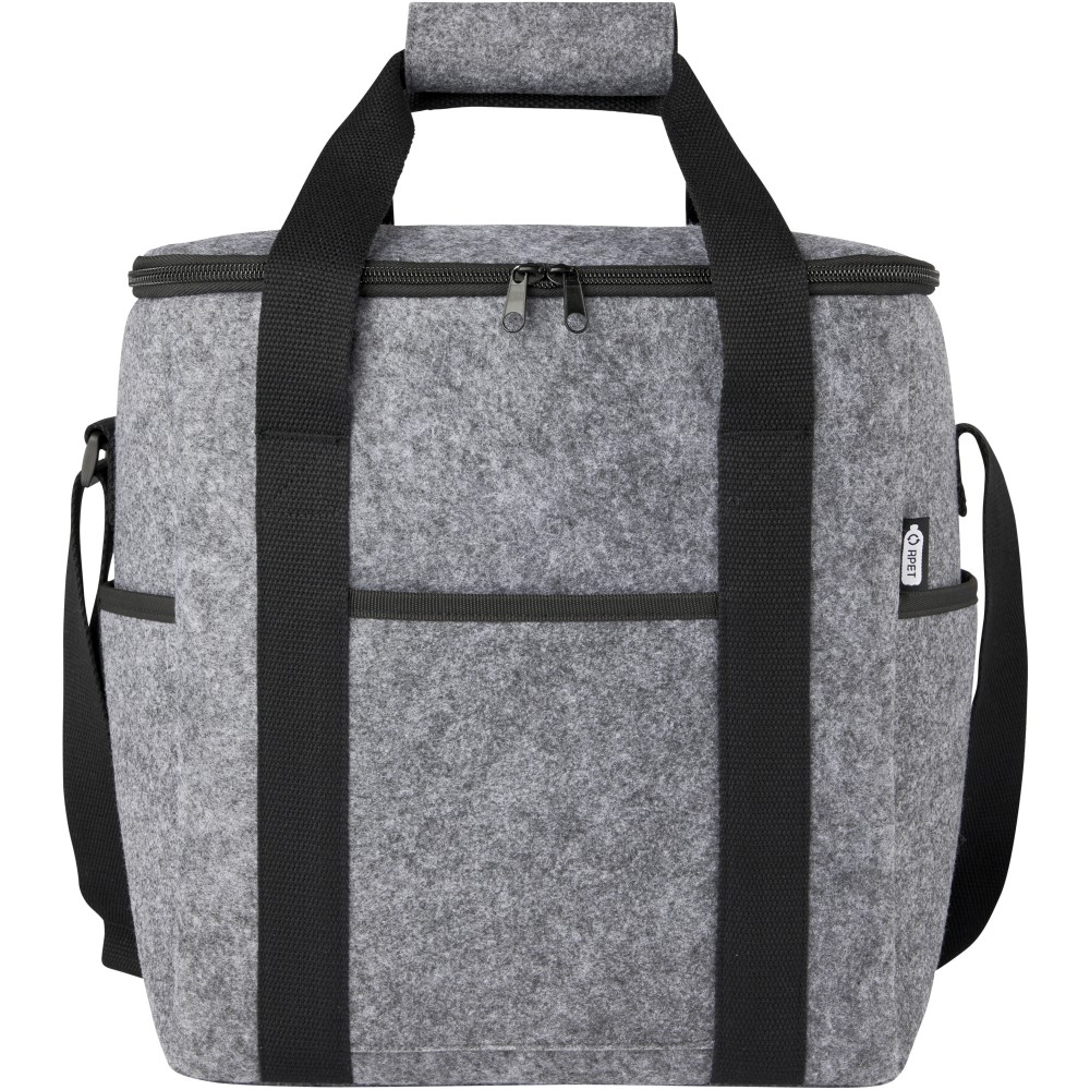 Nagyméretű hűtőtáska kiváló minőségű puha és tartós, GRS tanúsítvánnyal rendelkező újrahasznosított filcből. Tartalmaz egy nagy fő rekesszel (hat 1,5 literes palack), amely élelmiszer-biztonságos és extra vastag, nagy sűrűségű PEVA hőszigeteléssel van bélelve, amely órákon át hidegen tartja az italokat és a frissítőket. Felső cipzáras záródás, elülső zseb és két oldalsó zseb extra tároláshoz. Állítható hosszú pamut szőtt vállpántok (55 x 3,8 cm) és 2 szőtt pamut fogantyú (25 x 3,8 cm), felső kampóval és hurokkal zárható. Könnyen tisztítható. Űrtartalom: 21 liter. GRS tanúsítvánnyal rendelkező újrahasznosított poliészter. Emblémázás: Hímzés, Szitanyomás