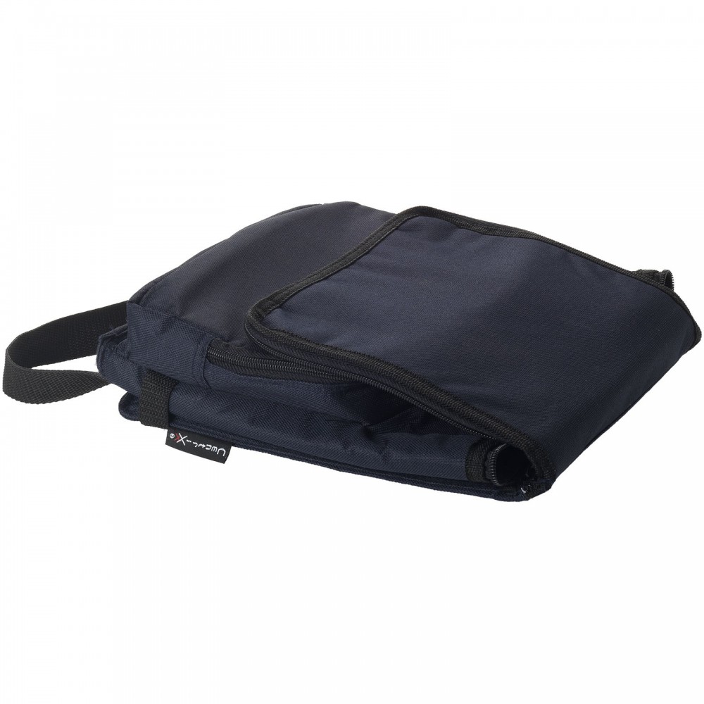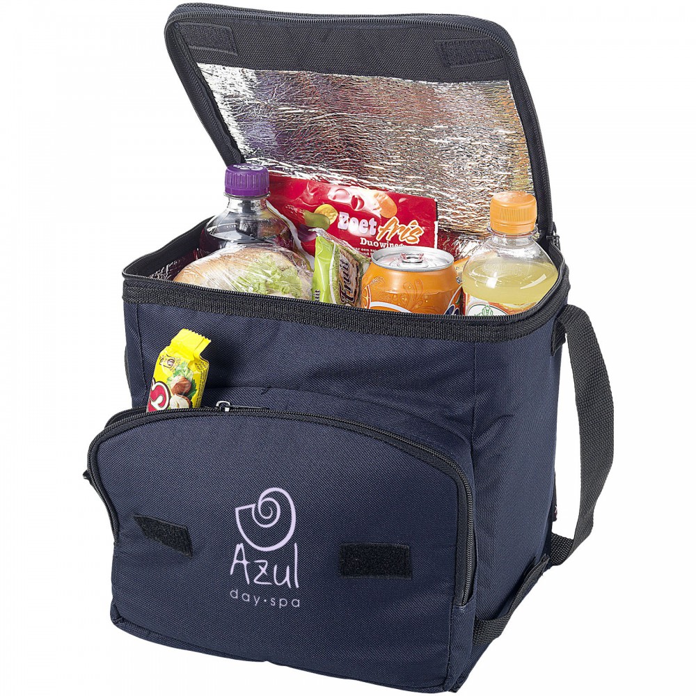 Összehajtható hűtőtáska cipzáras fő rekesszel és cipzáras elülső zsebbel. Állítható vállpánt. A hűtőtáska laposra hajtható az elülső zseben található horog és hurok segítségével. Egyéb kiegészítőt nem tartalmaz. Emblémázás: Szitanyomás