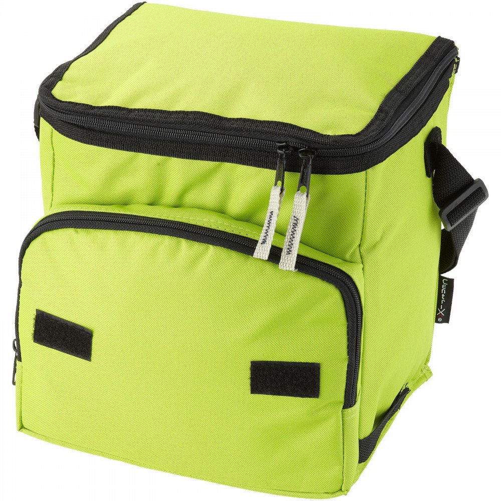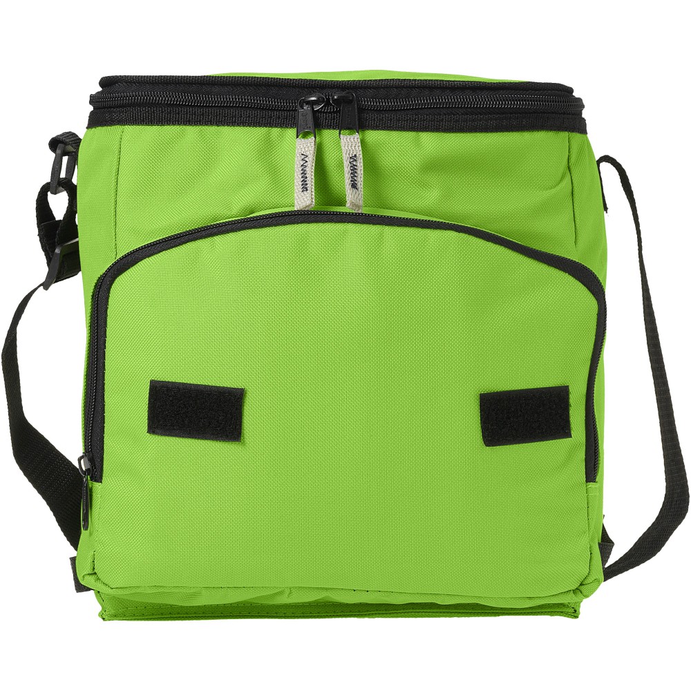 Összehajtható hűtőtáska cipzáras fő rekesszel és cipzáras elülső zsebbel. Állítható vállpánt. A hűtőtáska laposra hajtható az elülső zseben található horog és hurok segítségével. Egyéb kiegészítőt nem tartalmaz. Emblémázás: Szitanyomás