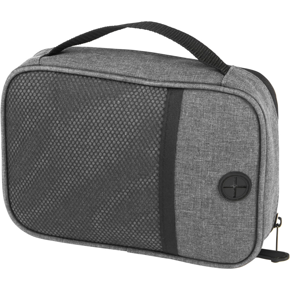 A Ross GRS újrahasznosított tech-táska ideális az állandóan úton lévők számára, és rendezetten tarthatja a powerbankokat, töltőkábeleket vagy bármilyen más elektronikus kiegészítőt. Több zsebbel, elasztikus hurokkal és egy kábelátvezető résszel rendelkezik, amely lehetővé teszi a powerbank tárolását, miközben a telefont tölti. Egy műanyag karabinerrel is rendelkezik egy másik táskához való rögzítéshez. Űrtartalom: 1 liter. Emblémázás: Szitanyomás