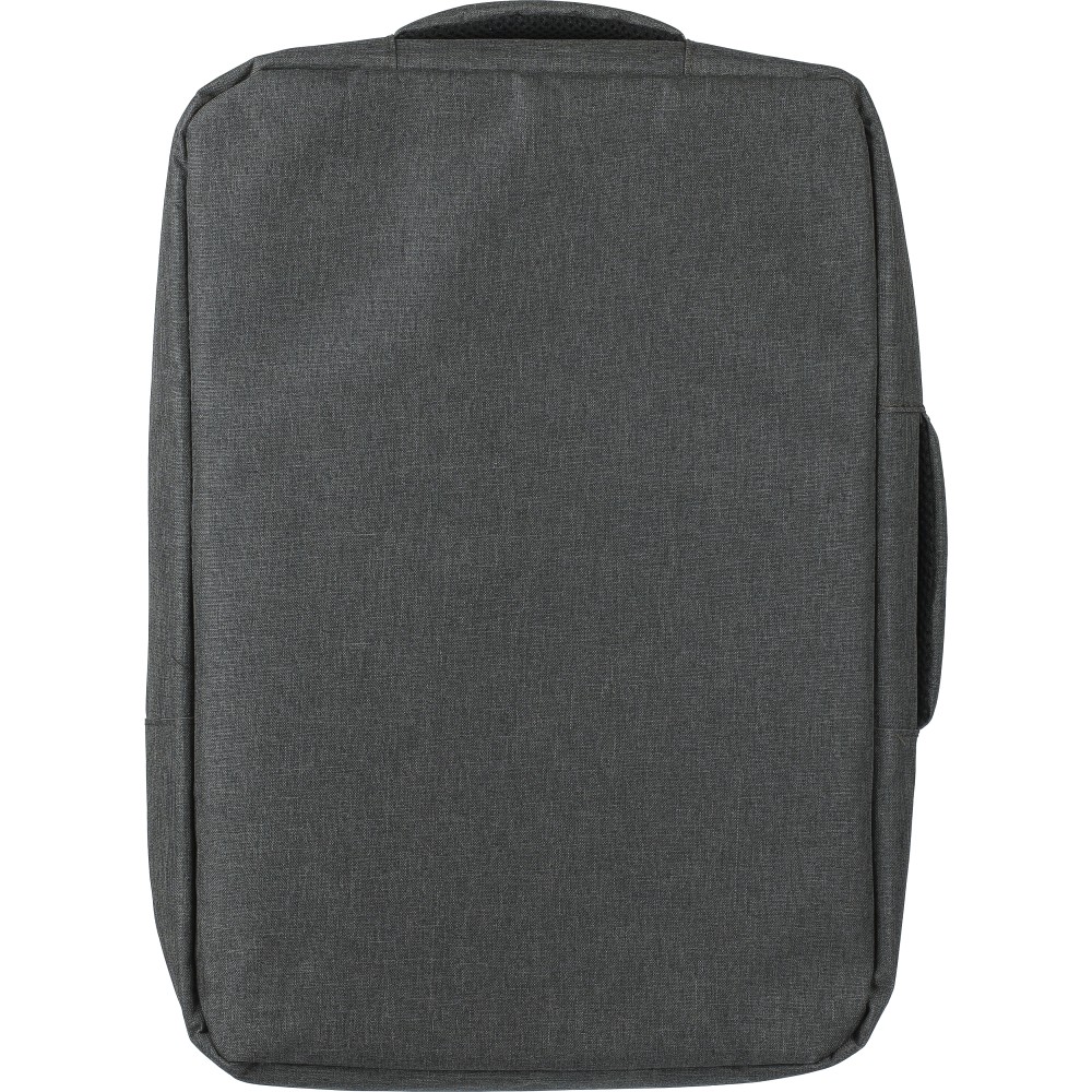 Laptophátizsák 300D rPET poliészter anyagból, 210D rPET béléssel. Egy nagy cipzáras rekesszel, számtalan belső zsebbel, tépőzáras laptoptartó zsebbel 15"-es laptop számára és 12 literes űrtartalommal. Megerősített, szellőző hátrésszel, állítható vállpánttal, oldalsó hordozófüllel és gurulóstáskára való felhelyezésre alkalmas pánttal. Teherbíró képesség: 10 kg. Emblémázás: Szitanyomás